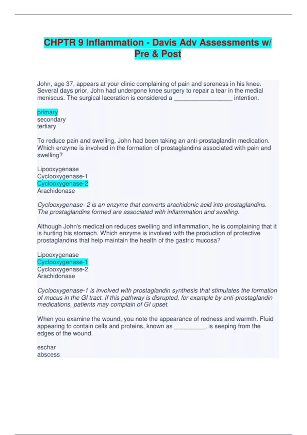 PATHOPHYSIOLOGY CHPTR 9 Inflammation - Davis Adv Assessments w/ Pre & Post John, age 37, appears at your clinic complaining of pain and soreness in his knee. Several days prior, John had undergone knee surgery to repair a tear in the medial meniscus. The surgical laceration is considered a _________________ intention. primary secondary tertiary To reduce pain and swelling, John had been taking an anti-prostaglandin medication. Which enzyme is involved in the formation of prostaglandins associated with pain and swelling? Lipooxygenase Cyclooxygenase-1 Cyclooxygenase-2 Arachidonase Cyclooxygenase- 2 is an enzyme that converts arachidonic acid into prostaglandins. The prostaglandins formed are associated with inflammation and swelling. Although John's medication reduces swelling and inflammation, he is complaining that it is hurting his stomach. Which enzyme is involved with the production of protective prostaglandins that help maintain the health of the gastric mucosa? Lipooxygenase Cyclooxygenase-1 Cyclooxygenase-2 Arachidonase Cyclooxygenase-1 is involved with prostaglandin synthesis that stimulates the formation of mucus in the GI tract. If this pathway is disrupted, for example by anti-prostaglandin medications, patients may complain of GI upset. When you examine the wound, you note the appearance of redness and warmth. Fluid appearing to contain cells and proteins, known as _________, is seeping from the edges of the wound.