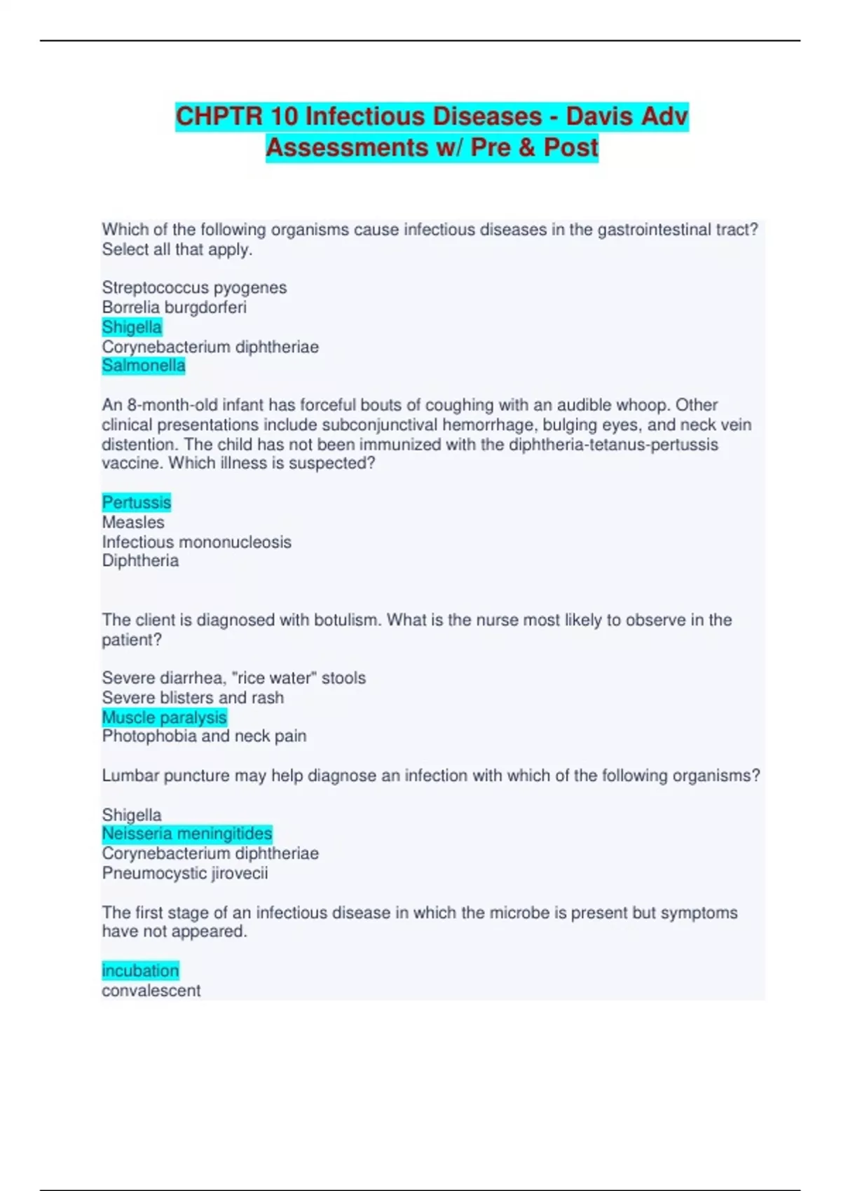 PATHOPHYSIOLOGY CHPTR 10 Infectious Diseases - Davis Adv Assessments w/ Pre & Post