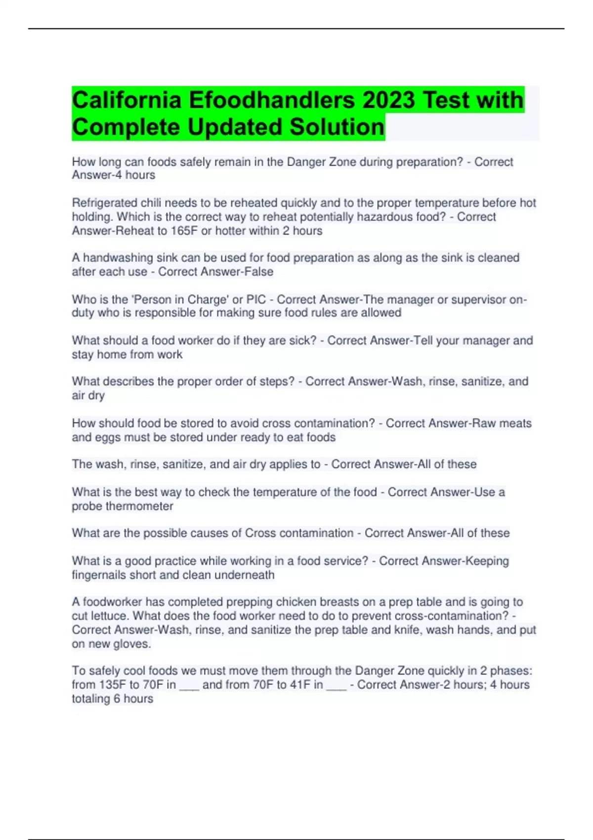 California Efoodhandlers 2023 Test with Complete Updated Solution