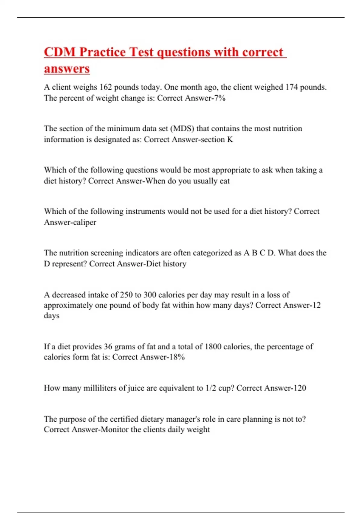 A client weighs 162 pounds today. One month ago, the client weighed 174 pounds. The percent of weight change is: Correct Answer-7% The section of the minimum data set (MDS) that contains the most nutrition information is designated as: Correct Answer-section K Which of the following questions would be most appropriate to ask when taking a diet history? Correct Answer-When do you usually eat Which of the following instruments would not be used for a diet history? Correct Answer-caliper The nutrition screening indicators are often categorized as A B C D. What does the D represent? Correct Answer-Diet history A decreased intake of 250 to 300 calories per day may result in a loss of approximately one pound of body fat within how many days? Correct Answer-12 days If a diet provides 36 grams of fat and a total of 1800 calories, the percentage of calories form fat is: Correct Answer-18% How many milliliters of juice are equivalent to 1/2 cup? Correct Answer-120 The purpose of the certified dietary manager's role in care planning is not to? Correct Answer-Monitor the clients daily weight