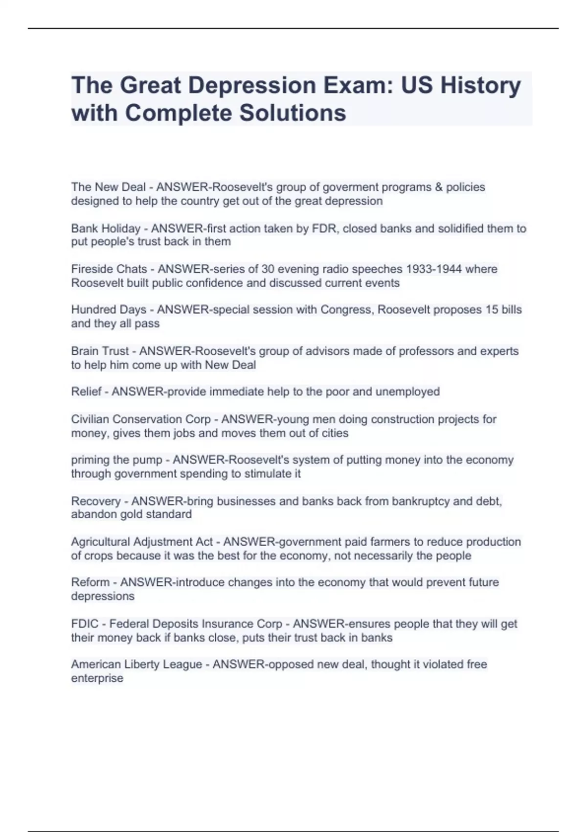 The Great Depression Exam: US History with Complete SolutionsThe Great Depression Exam: US History with Complete SolutionsThe Great Depression Exam: US History with Complete SolutionsThe Great Depression Exam: US History with Complete Solutions The New Deal - ANSWER-Roosevelt's group of goverment programs & policies designed to help the country get out of the great depression Bank Holiday - ANSWER-first action taken by FDR, closed banks and solidified them to put people's trust back in them Fireside Chats - ANSWER-series of 30 evening radio speeches where Roosevelt built public confidence and discussed current events Hundred Days - ANSWER-special session with Congress, Roosevelt proposes 15 bills and they all pass Brain Trust - ANSWER-Roosevelt's group of advisors made of professors and experts to help him come up with New Deal Relief - ANSWER-provide immediate help to the poor and unemployed
