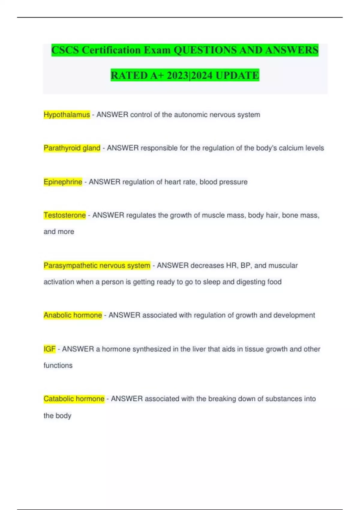 CSCS Certification Exam QUESTIONS AND ANSWERS RATED A+ 2023|2024 UPDATE Hypothalamus - ANSWER control of the autonomic nervous system Parathyroid gland - ANSWER responsible for the regulation of the body's calcium levels Epinephrine - ANSWER regulation of heart rate, blood pressure Testosterone - ANSWER regulates the growth of muscle mass, body hair, bone mass, and more Parasympathetic nervous system - ANSWER decreases HR, BP, and muscular activation when a person is getting ready to go to sleep and digesting food Anabolic hormone - ANSWER associated with regulation of growth and development IGF - ANSWER a hormone synthesized in the liver that aids in tissue growth and other functions Catabolic hormone - ANSWER associated with the breaking down of substances into the body