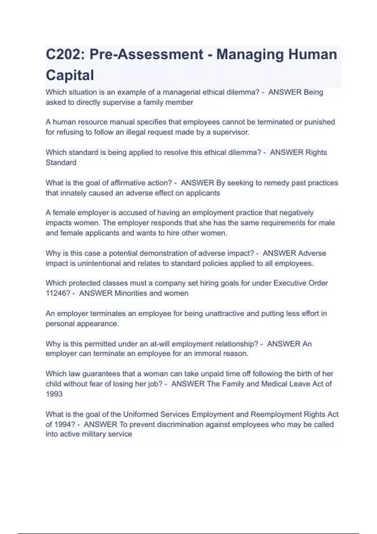 C202: Pre-Assessment - Managing Human Capital WITH COMPLETE ANSWER SOLUTIONS 2023/2024