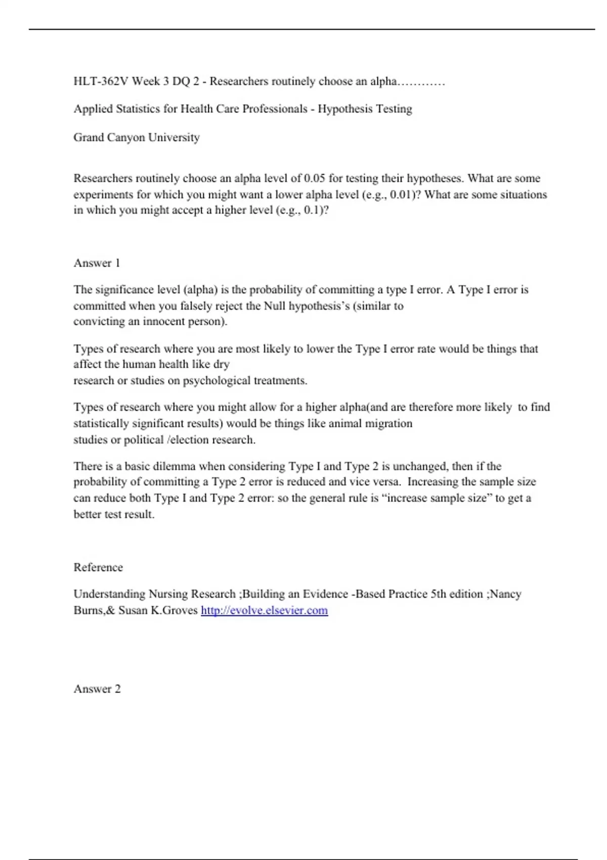 HLT-362V Week 3 DQ 2 - Researchers routinely choose an alpha………… Applied Statistics for Health Care Professionals - Hypothesis Testing Grand Canyon University Researchers routinely choose an alpha level of 0.05 for testing their hypotheses. What are some experiments for which you might want a lower alpha level (e.g., 0.01)? What are some situations in which you might accept a higher level (e.g., 0.1)? Answer 1 The significance level (alpha) is the probability of committing a type I error. A Type I error is committed when you falsely reject the Null hypothesis’s (similar to convicting an innocent person).