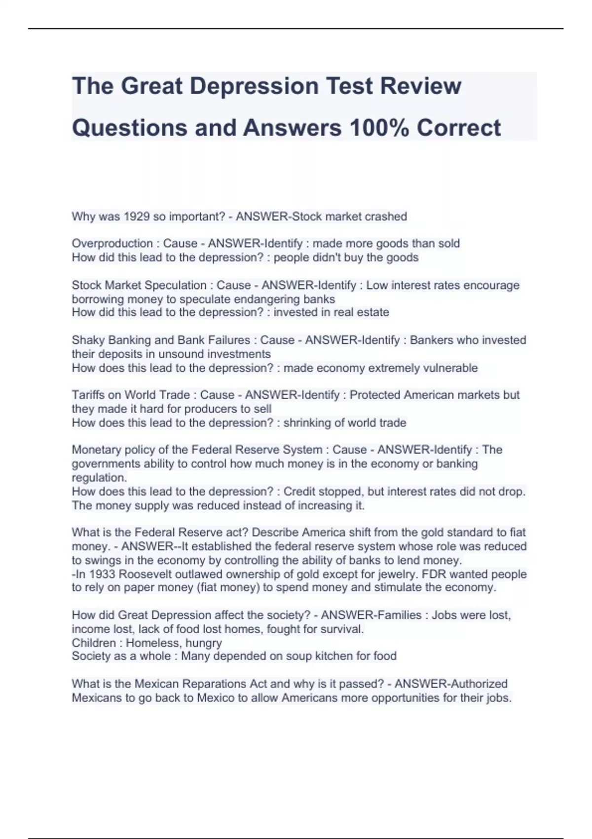 The Great Depression Test Review Questions and Answers 100% CorrectThe Great Depression Test Review Questions and Answers 100% CorrectThe Great Depression Test Review Questions and Answers 100% CorrectThe Great Depression Test Review Questions and Answers 100% CorrectWhy was 1929 so important? - ANSWER-Stock market crashed Overproduction : Cause - ANSWER-Identify : made more goods than sold How did this lead to the depression? : people didn't buy the goods Stock Market Speculation : Cause - ANSWER-Identify : Low interest rates encourage borrowing money to speculate endangering banks How did this lead to the depression? : invested in real estate Shaky Banking and Bank Failures : Cause - ANSWER-Identify : Bankers who invested their deposits in unsound investments How does this lead to the depression? : made economy extremely vulnerable Tariffs on World Trade : Cause - ANSWER-Identify : Protected American markets but they made it hard for producers to sell How does this lead to the depression? : shrinking of world trade