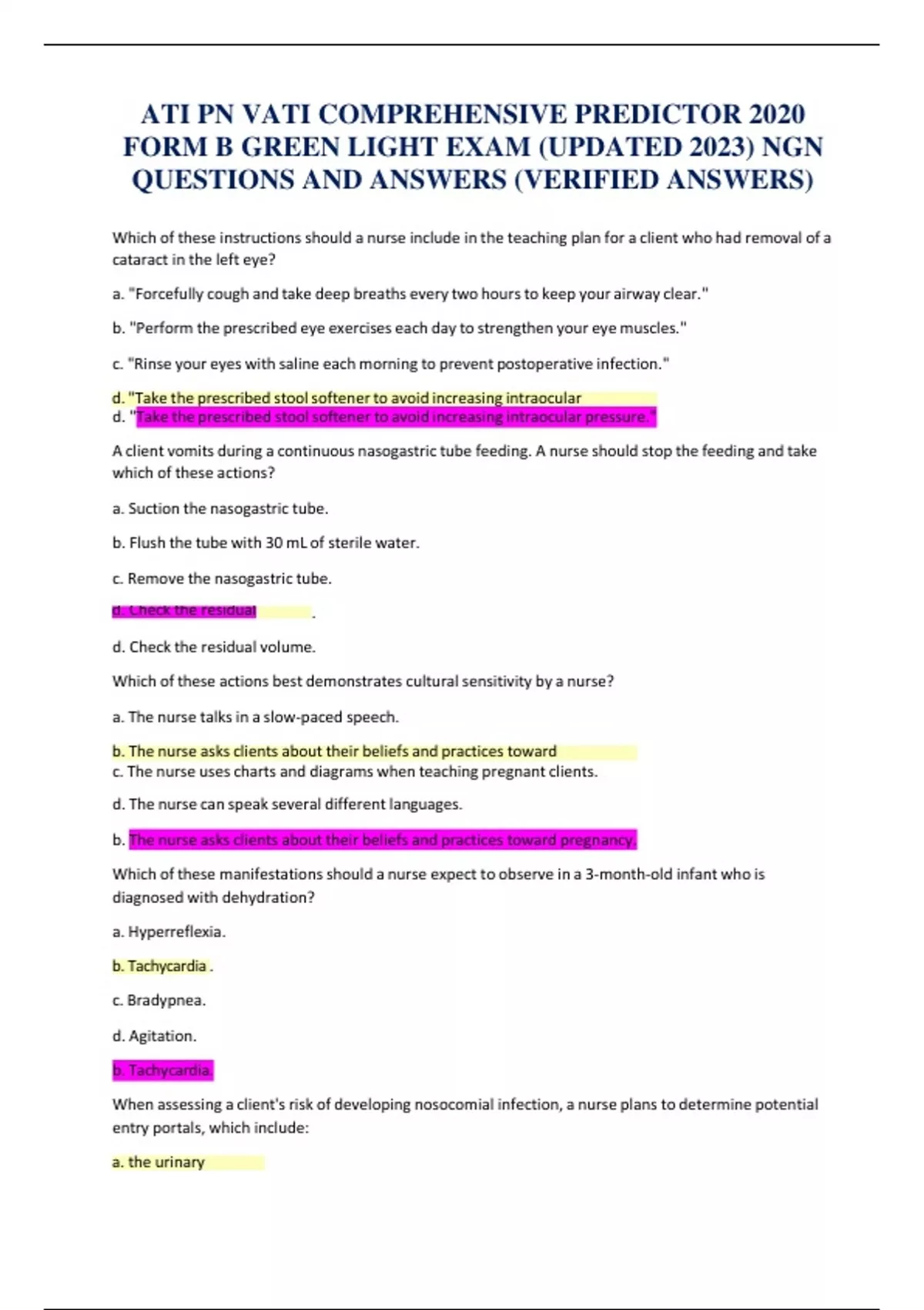 2020 ATI PN VATI COMPREHENSIVE PREDICTOR FORM B GREEN LIGHT EXAM (UPDATED 2023) NGN QUESTIONS AND ANSWERS (VERIFIED ANSWERS) Which of these instructions should a nurse include in the teaching plan for a client who had removal of a cataract in the left eye? a. "Forcefully cough and take deep breaths every two hours to keep your airway clear." b. "Perform the prescribed eye exercises each day to strengthen your eye muscles." c. "Rinse your eyes with saline each morning to prevent postoperative infection." d. "Take the prescribed stool softener to avoid increasing intraocular pressure." A client vomits during a continuous nasogastric tube feeding. A nurse should stop the feeding and take which of these actions? a. Suction the nasogastric tube. b. Flush the tube with 30 mL of sterile water. c. Remove the nasogastric tube. . d. Check the residual volume. Which of these actions best demonstrates cultural sensitivity by a nurse? a. The nurse talks in a slow-paced speech. c. The nurse uses charts and diagrams when teaching pregnant clients. d. The nurse can speak several different languages. b. The nurse asks clients about their beliefs and practices toward pregnancy. Which of these manifestations should a nurse expect to observe in a 3-month-old infant who is diagnosed with dehydration? a. Hyperreflexia. . c. Bradypnea. d. Agitation. b. Tachycardia. When assessing a client's risk of developing nosocomial infection, a nurse plans to determine potential entry portals, which include: b. vomitus. c. contaminated water. d. sexual intercourse. a. the urinary meatus. A client who is on the inpatient psychiatric unit has a history of violence. Which of these actions should a nurse take if the client is agitated? b. Lock the client in a secluded room. c. Ask the other clients to give feedback regarding the client's behavior. d. Ignore the client's inappropriate behavior. a. Encourage the client to verbalize feelings. Which of these measures should a nurse include when planning care for a school-aged child during a sickle cell crisis episode? a. Monitoring for signs of bleeding. c. Administering cool sponge baths to reduce fevers. d. Offering a high calorie diet. b. Providing pain relief. Which of these instructions should a nurse include in the plan of care for a 32-week gestation client who had an amniocentesis today? a. "Drink at least six glasses of fluids during the next six hours after the test." b. "Call the clinic if you experience any abdominal