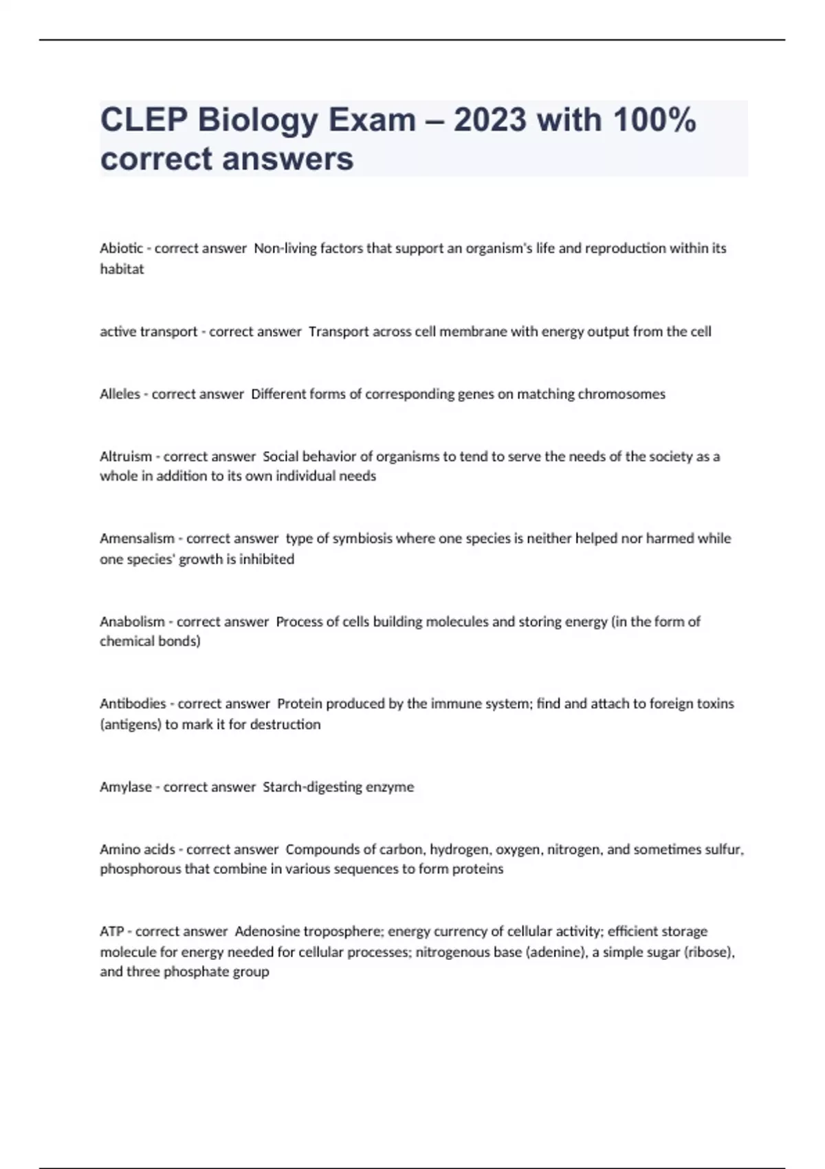 CLEP Biology Exam – 2023 with 100% correct answers