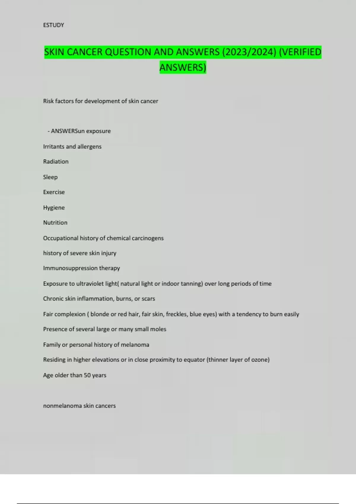 SKIN CANCER QUESTION AND ANSWERS (2023/2024) (VERIFIED ANSWERS)