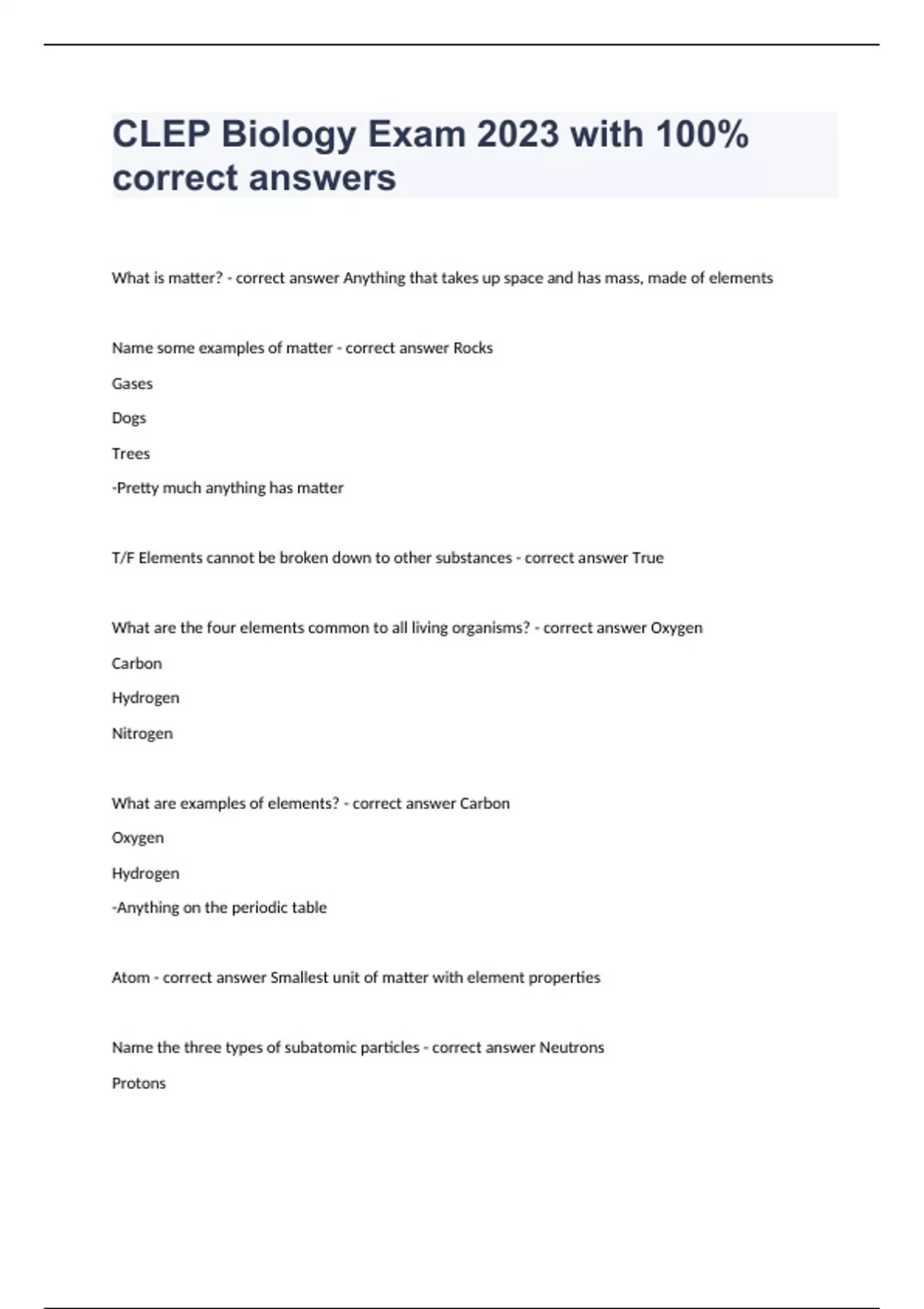 What is matter? - correct answer Anything that takes up space and has mass, made of elements Name some examples of matter - correct answer Rocks Gases Dogs Trees -Pretty much anything has matter T/F Elements cannot be broken down to other substances - correct answer True What are the four elements common to all living organisms? - correct answer Oxygen Carbon Hydrogen Nitrogen What are examples of elements? - correct answer Carbon Oxygen Hydrogen -Anything on the periodic table Atom - correct answer Smallest unit of matter with element properties Name the three types of subatomic particles - correct answer Neutrons Protons Electron