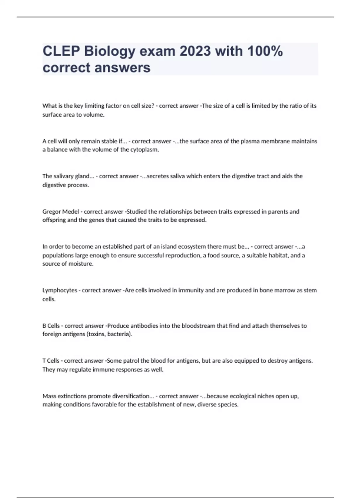 What is the key limiting factor on cell size? - correct answer -The size of a cell is limited by the ratio of its surface area to volume. A cell will only remain stable if... - correct answer -...the surface area of the plasma membrane maintains a balance with the volume of the cytoplasm. The salivary gland... - correct answer -...secretes saliva which enters the digestive tract and aids the digestive process. Gregor Medel - correct answer -Studied the relationships between traits expressed in parents and offspring and the genes that caused the traits to be expressed. In order to become an established part of an island ecosystem there must be... - correct answer -...a populations large enough to ensure successful reproduction, a food source, a suitable habitat, and a source of moisture. Lymphocytes - correct answer -Are cells involved in immunity and are produced in bone marrow as stem cells. B Cells - correct answer -Produce antibodies into the bloodstream that find and attach themselves to foreign antigens (toxins, bacteria). T Cells - correct answer -Some patrol the blood for antigens, but are also equipped to destroy antigens. They may regulate immune responses as well. Mass extinctions promote diversification... - correct answer -...because ecological niches open up, making conditions favorable for the establishment of new, diverse species. Common eleme