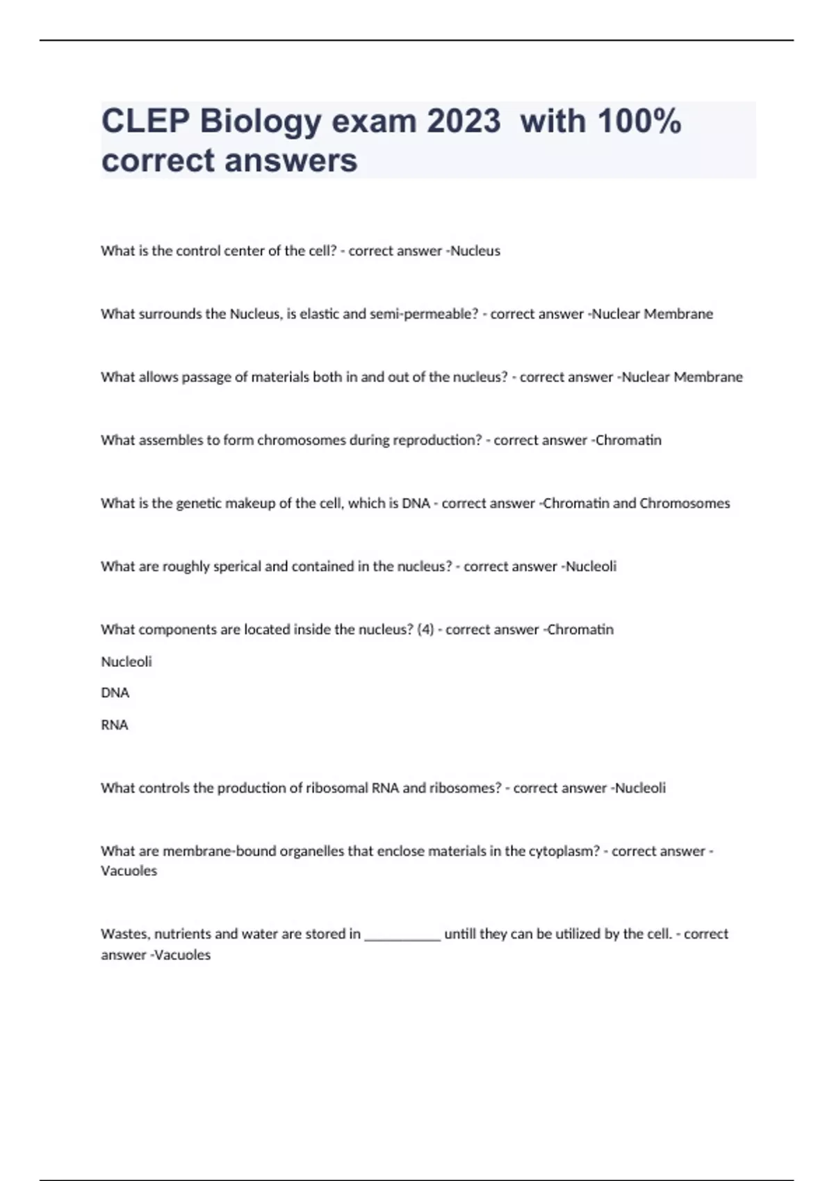 What is the control center of the cell? - correct answer -Nucleus What surrounds the Nucleus, is elastic and semi-permeable? - correct answer -Nuclear Membrane What allows passage of materials both in and out of the nucleus? - correct answer -Nuclear Membrane What assembles to form chromosomes during reproduction? - correct answer -Chromatin What is the genetic makeup of the cell, which is DNA - correct answer -Chromatin and Chromosomes What are roughly sperical and contained in the nucleus? - correct answer -Nucleoli What components are located inside the nucleus? (4) - correct answer -Chromatin Nucleoli DNA RNA What controls the production of ribosomal RNA and ribosomes? - correct answer -Nucleoli What are membrane-bound organelles that enclose materials in the cytoplasm? - correct answer -Vacuoles Wastes, nutrients and water are stored in __________ untill they can be utilized by the cell. - correct answer -Vacuoles What is part of the cell were a major portion of the energy needed for cell function is produced? - correct answer -Mitochondria What has doub