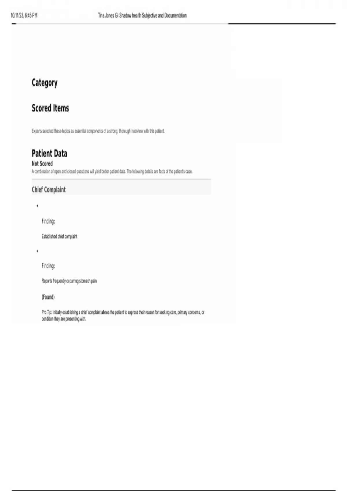 Tina Jones GI Shadow health Subjective and Documentation