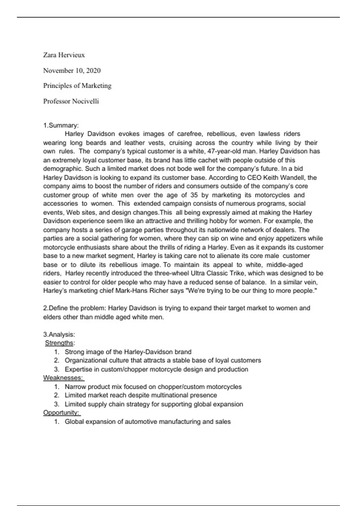 The case study on Harley Davidson includes a summary, the problem, swat analysis, alternatives, and recommendations.