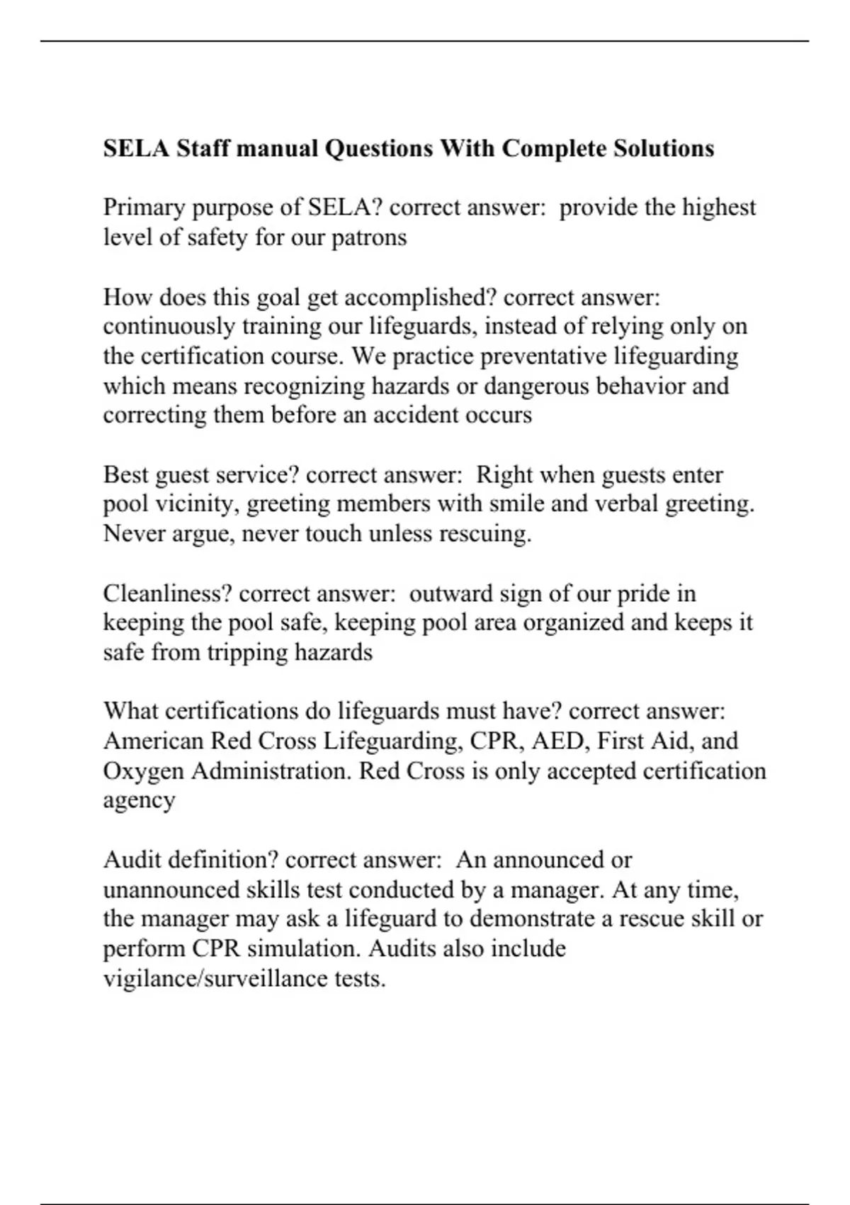 Primary purpose of SELA? correct answer: provide the highest level of safety for our patrons How does this goal get accomplished? correct answer: continuously training our lifeguards, instead of relying only on the certification course. We practice preventative lifeguarding which means recognizing hazards or dangerous behavior and correcting them before an accident occurs Best guest service? correct answer: Right when guests enter pool vicinity, greeting members with smile and verbal greeting. Never argue, never touch unless rescuing. Cleanliness? correct answer: outward sign of our pride in keeping the pool safe, keeping pool area organized and keeps it safe from tripping hazards What certifications do lifeguards must have? correct answer: American Red Cross Lifeguarding, CPR, AED, First Aid, and Oxygen Administration. Red Cross is only accepted certification agency Audit definition? correct answer: An announced or unannounced skills test conducted by a manager. At any time, the manager may ask a lifeguard to demonstrate a rescue skill or perform CPR simulation. Audits also include vigilance/surveillance tests. In service definition? correct answer: A required staff meeting and skills practice. The trainer will use this time to practice rescue skills with the staff and ensure that everyone is up to date on skills. In-services are mandatory; see "Scheduling" for rules on in-services. In-services may be in-person, online modules, or both. What course is required before working? correct answer: Online employee orientation The first in-service of the summer will certify you in Administering Emergency Oxygen (AEO). Like all in-services, attendance is required. AEO certification at the in-service is free. Should you miss the AEO in-service, you will need to schedule an AEO session (for a fee). If you do not obtain AEO before July 1, you will only be eligible for $.75/hour of bonus, and if you do not obtain AEO at all you will only be eligible for up to $.50/hr of bonus pay. Uniform requirements correct answer: Employees must come to work in full uniform from head to toe at the start of each shift; changing clothes at work is not permitted. If a member of pool and staying, then must change out of lifeguard member If an employee arrives at work and has forgotten any piece of his/her uniform or is not meeting the standards of personal appearance in this manual, the employee is considered "not prepared" for work that day. As a result, the employee will earn minimum wage for the day, and the day's hours will not count towards the season bonus. Repeated infractions or intentional disregard of uniform policies will result in disciplinary action. A supervisor who fails to report an infraction will receive the same penalty as the employees who violated the p