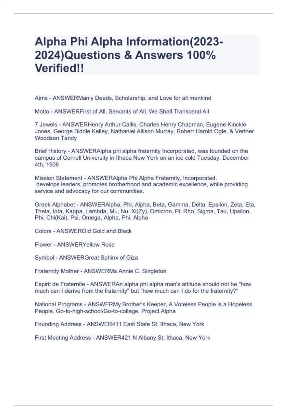 Aims - ANSWERManly Deeds, Scholarship, and Love for all mankind Motto - ANSWERFirst of All, Servants of All, We Shall Transcend All 7 Jewels - ANSWERHenry Arthur Callis, Charles Henry Chapman, Eugene Kinckle Jones, George Biddle Kelley, Nathaniel Allison Murray, Robert Harold Ogle, & Vertner Woodson Tandy Brief History - ANSWERAlpha phi alpha fraternity Incorporated, was founded on the campus of Cornell University in Ithaca New York on an ice cold Tuesday, December 4th, 1906 Mission Statement - ANSWERAlpha Phi Alpha Fraternity, Incorporated. develops leaders, promotes brotherhood and academic excellence, while providing service and advocacy for our communities. Greek Alphabet - ANSWERAlpha, Phi, Alpha, Beta, Gamma, Delta, Epsilon, Zeta, Eta, Theta, Iota, Kappa, Lambda, Mu, Nu, Xi(Zy), Omicron, Pi, Rho, Sigma, Tau, Upsilon, Phi, Chi(Kai), Psi, Omega, Alpha, Phi, Alpha Colors - ANSWEROld Gold and Black Flower - ANSWERYellow Rose Symbol - ANSWERGreat Sphinx of Giza Fraternity Mother - ANSWERMs Annie C. Singleton Espirit de Fraternite - ANSWERAn alpha phi alpha man's attitude should not be "how much can I derive from the fraternity" but "how much can I do for the fraternity?" National Programs - ANSWERMy Brother's Keeper, A Voteless People is a Hopeless People, Go-to-high-school/Go-to-college, Project Alpha Founding Address - ANSWER411 East State St, Ithaca, New York First Meeting Address - ANSWER421 N Albany St, Ithaca, New York Headquarters address - ANSWER2313 Saint Paul Street, Baltimore, Maryland 21218 7Ps - ANSWERProper Prior Preparation Prevents Piss Poor Performance Excuses - ANSWERExcuses are monuments of nothing: they build bridges that lead to nowhere. And those who use these tools of incompetence are masters of nothing. Therefore we do not use excuses. Objectives - ANSWERto stimulate the ambition of its members; to prepare them for the greatest usefulness in the causes of humanity, freedom, and dignity of the individual; to encourage the highest and noblest form of manhood; to aid downtrodden humanity in its efforts to achieve higher social, economic and intellectual status