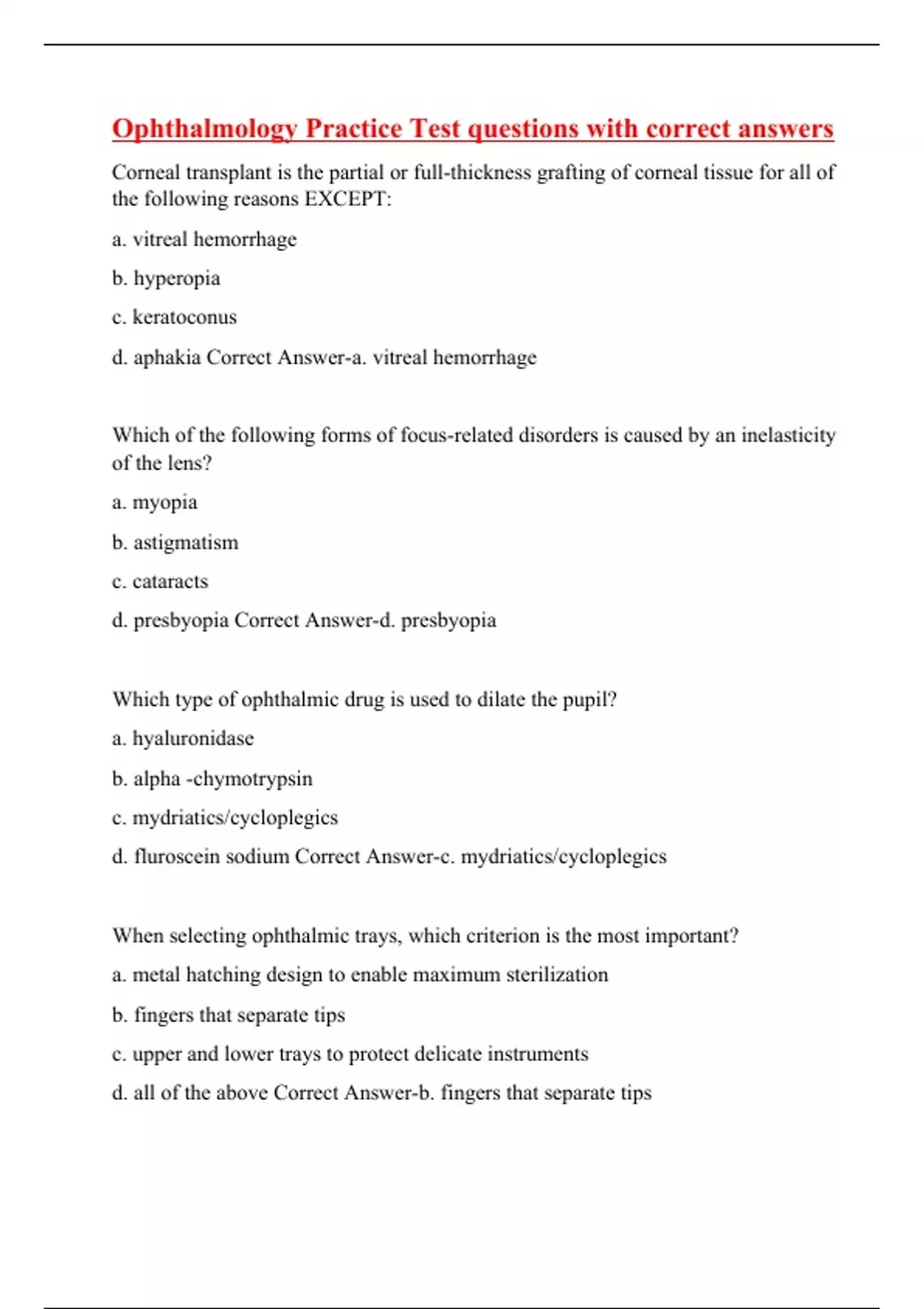 Corneal transplant is the partial or full-thickness grafting of corneal tissue for all of the following reasons EXCEPT: a. vitreal hemorrhage b. hyperopia c. keratoconus d. aphakia Correct Answer-a. vitreal hemorrhage Which of the following forms of focus-related disorders is caused by an inelasticity of the lens? a. myopia b. astigmatism c. cataracts d. presbyopia Correct Answer-d. presbyopia Which type of ophthalmic drug is used to dilate the pupil? a. hyaluronidase b. alpha -chymotrypsin c. mydriatics/cycloplegics d. fluroscein sodium Correct Answer-c. mydriatics/cycloplegics When selecting ophthalmic trays, which criterion is the most important? a. metal hatching design to enable max