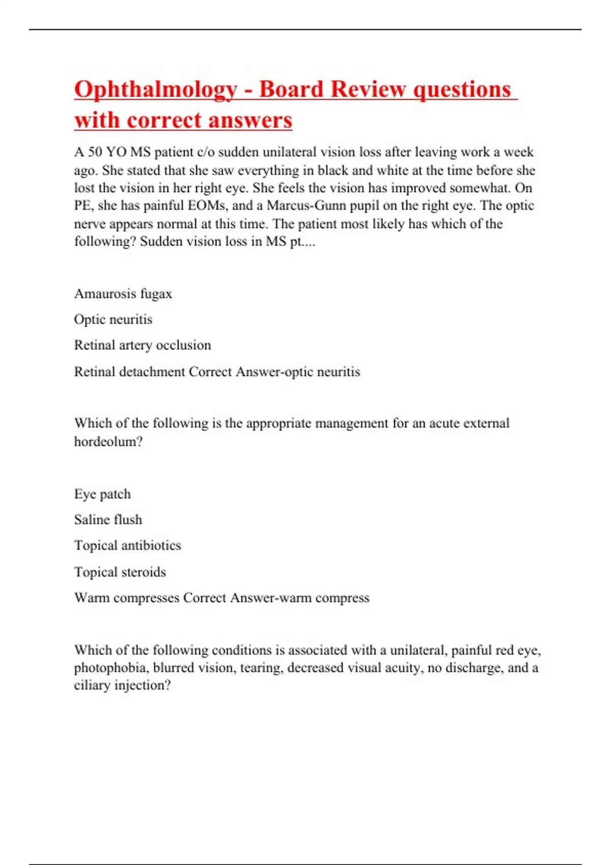 A 50 YO MS patient c/o sudden unilateral vision loss after leaving work a week ago. She stated that she saw everything in black and white at the time before she lost the vision in her right eye. She feels the vision has improved somewhat. On PE, she has painful EOMs, and a Marcus-Gunn pupil on the right eye. The optic nerve appears normal at this time. The patient most likely has which of the following? Sudden vision loss in MS pt.... Amaurosis fugax Optic neuritis Retinal artery occlusion Retinal detachment Correct Answer-optic neuritis Which of the following is the appropriate management for an acute external hordeolum? Eye patch Saline flush Topical antibiotics Topical steroids Warm compresses Correct Answer-warm compress Which of the following conditions is associated with a unilateral, painful red eye, photophobia, blurred vision, tearing, decreased visual acuity, no discharge, and a ciliary injection?