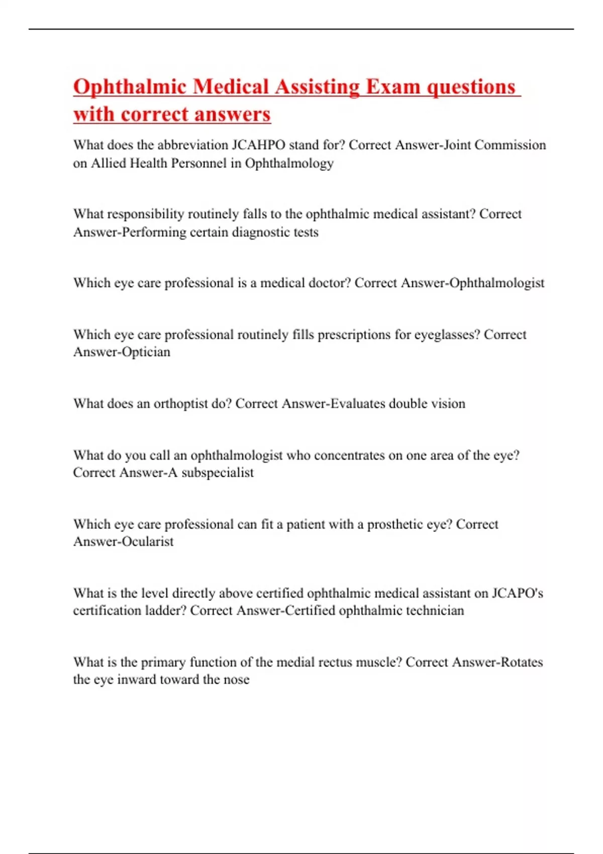What does the abbreviation JCAHPO stand for? Correct Answer-Joint Commission on Allied Health Personnel in Ophthalmology What responsibility routinely falls to the ophthalmic medical assistant? Correct Answer-Performing certain diagnostic tests Which eye care professional is a medical doctor? Correct Answer-Ophthalmologist Which eye care professional routinely fills prescriptions for eyeglasses? Correct Answer-Optician What does an orthoptist do? Correct Answer-Evaluates double vision What do you call an ophthalmologist who concentrates on one area of the eye? Correct Answer-A subspecialist Which eye care professional can fit a patient with a prosthetic eye? Correct Answer-Ocularist What is the level directly above certified ophthalmic medical assistant on JCAPO's certification ladder? Correct Answer-Certified ophthalmic technician What is the primary function of the medial rectus muscle? Correct Answer-Rotates the eye inward toward the nose