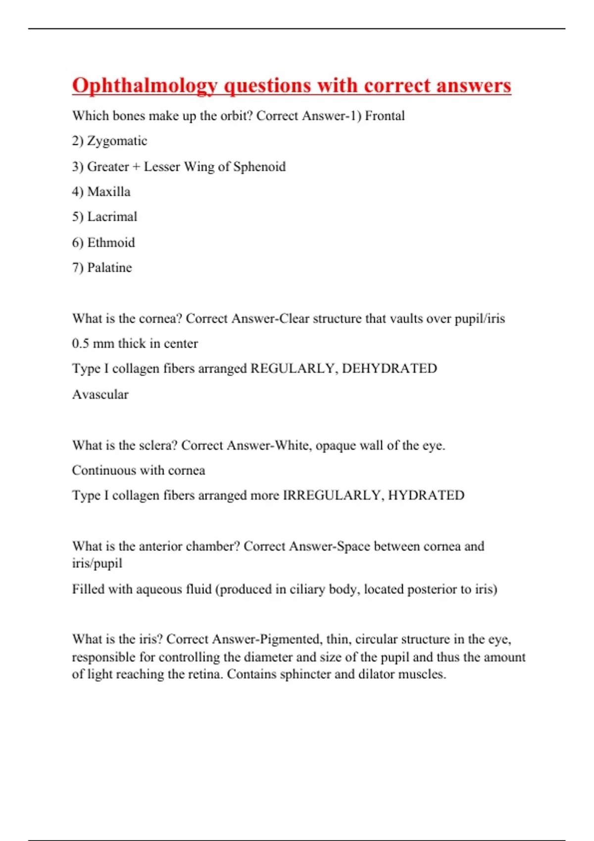 Which bones make up the orbit? Correct Answer-1) Frontal 2) Zygomatic 3) Greater + Lesser Wing of Sphenoid 4) Maxilla 5) Lacrimal 6) Ethmoid 7) Palatine What is the cornea? Correct Answer-Clear structure that vaults over pupil/iris 0.5 mm thick in center Type I collagen fibers arranged REGULARLY, DEHYDRATED Avascular What is the sclera? Correct Answer-White, opaque wall of the eye. Continuous with cornea Type I collagen fibers arranged more IRREGULARLY, HYDRATED What is the anterior chamber? Correct Answer-Space between cornea and iris/pupil Filled with aqueous fluid (produced in ciliary body, located posterior to iris) What is the iris? Correct Answer-Pigmented, thin, circular structure in the eye, responsible for controlling the diameter and size of the pupil and thus the amount of light reaching the retina. Contains sphincter and dilator muscles.