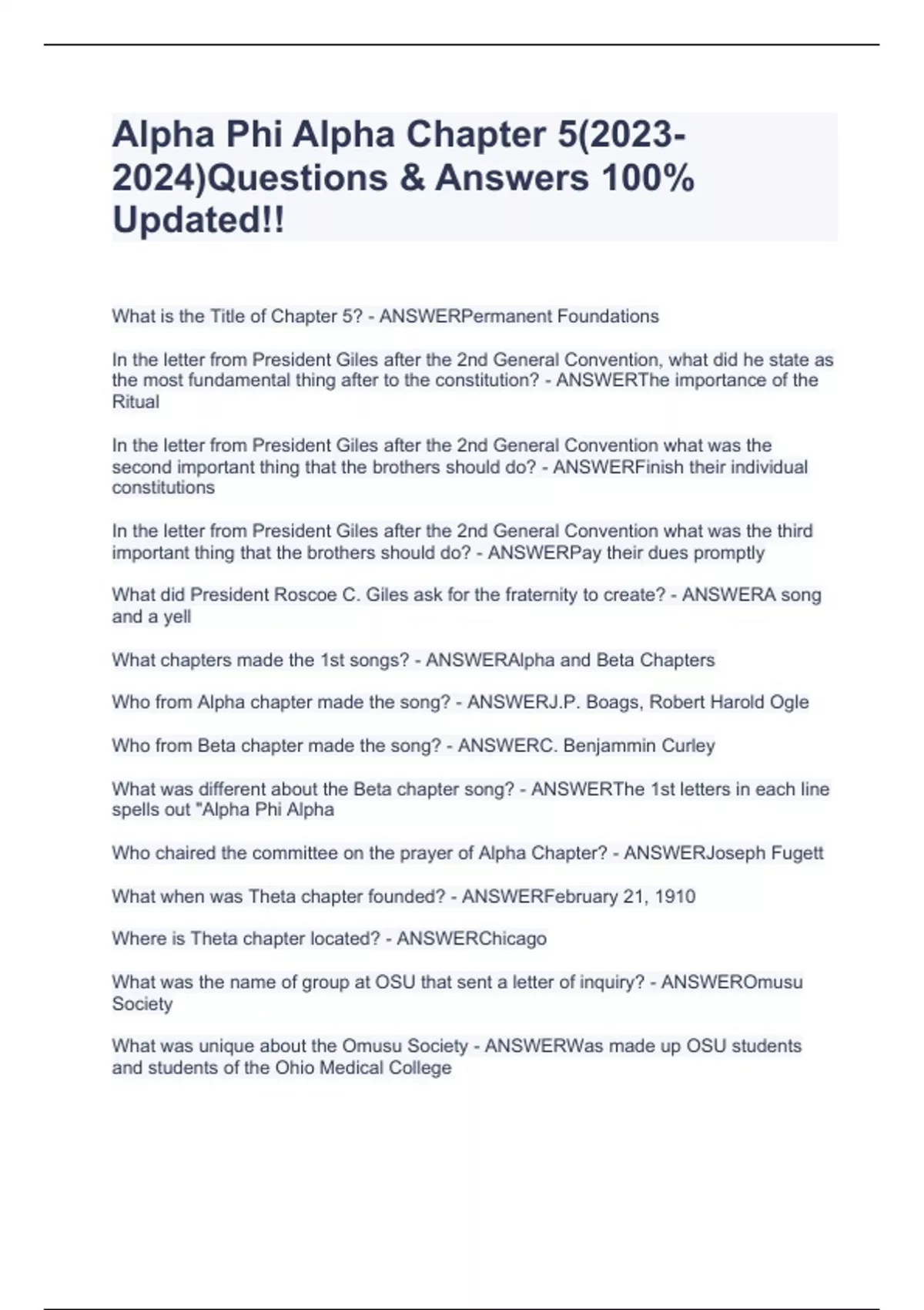 What is the Title of Chapter 5? - ANSWERPermanent Foundations In the letter from President Giles after the 2nd General Convention, what did he state as the most fundamental thing after to the constitution? - ANSWERThe importance of the Ritual In the letter from President Giles after the 2nd General Convention what was the second important thing that the brothers should do? - ANSWERFinish their individual constitutions In the letter from President Giles after the 2nd General Convention what was the third important thing that the brothers should do? - ANSWERPay their dues promptly What did President Roscoe C. Giles ask for the fraternity to create? - ANSWERA song and a yell What chapters made the 1st songs? - ANSWERAlpha and Beta Chapters Who from Alpha chapter made the song? - ANSWERJ.P. Boags, Robert Harold Ogle Who from Beta chapter made the song? - ANSWERC. Benjammin Curley What was different about the Beta chapter song? - ANSWERThe 1st letters in each line spells out "Alpha Phi Alpha Who chaired the committee on the prayer of Alpha Chapter? - ANSWERJoseph Fugett What when was Theta chapter founded? - ANSWERFebruary 21, 1910 Where is Theta chapter located? - ANSWERChicago What was the name of group at OSU that sent a letter of inquiry? - ANSWEROmusu Society What was unique about the Omusu Society - ANSWERWas made up OSU students and students of the Ohio Medical College Where was the 3rd general convention held? - ANSWERPhiladelphia, PA. W