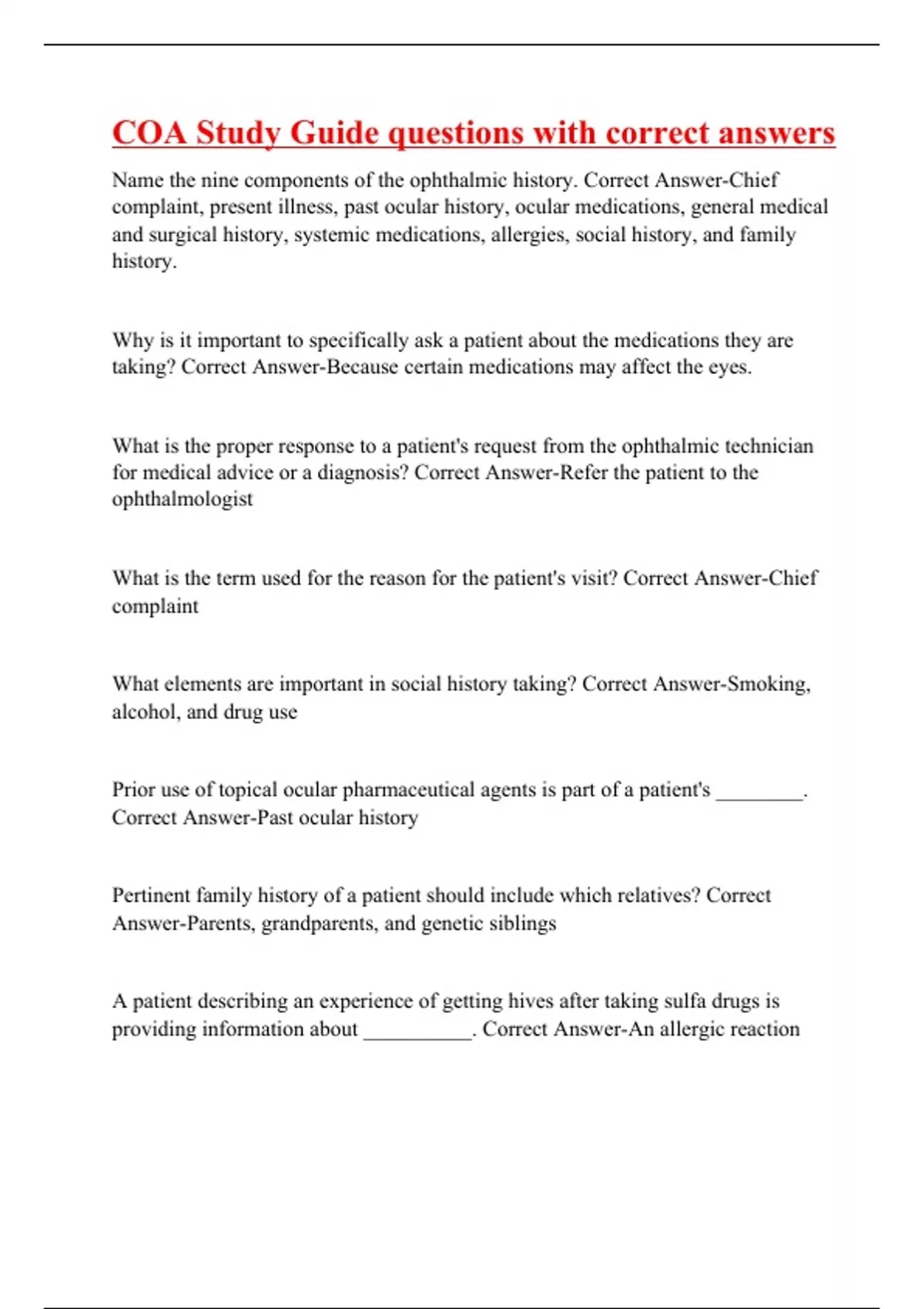 Name the nine components of the ophthalmic history. Correct Answer-Chief complaint, present illness, past ocular history, ocular medications, general medical and surgical history, systemic medications, allergies, social history, and family history. Why is it important to specifically ask a patient about the medications they are taking? Correct Answer-Because certain medications may affect the eyes. What is the proper response to a patient's request from the ophthalmic technician for medical advice or a diagnosis? Correct Answer-Refer the patient to the ophthalmologist What is the term used for the reason for the patient's visit? Correct Answer-Chief complaint What elements are important in social history taking? Correct Answer-Smoking, alcohol, and drug use Prior use of topical ocular pharmaceutical agents is part of a patient's ________. Correct Answer-Past ocular history Pertinent family history of a patient should include which relatives? Correct Answer-Parents, grandparents, and