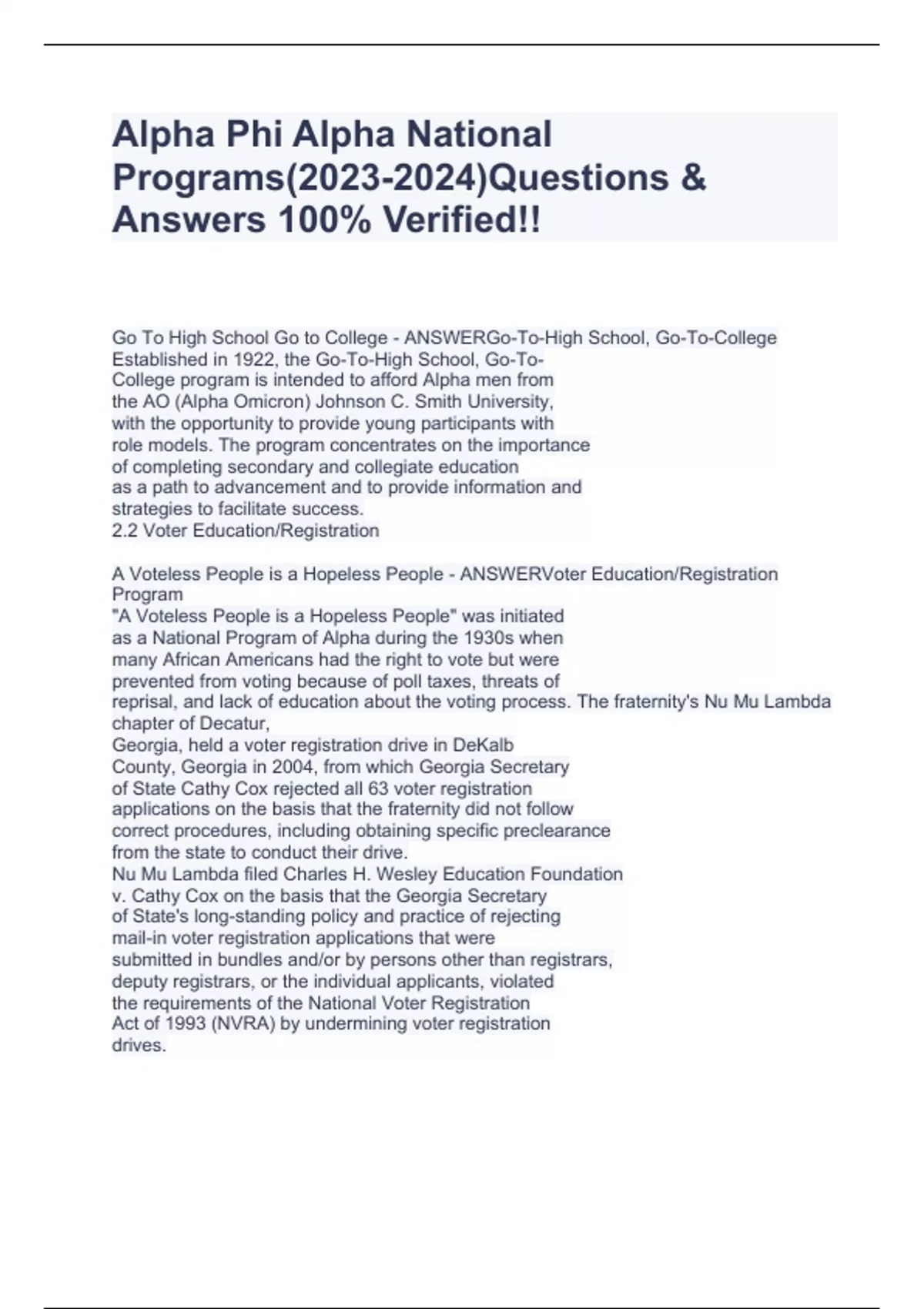 Go To High School Go to College - ANSWERGo-To-High School, Go-To-College Established in 1922, the Go-To-High School, Go-To- College program is intended to afford Alpha men from the ΑΟ (Alpha Omicron) Johnson C. Smith University, with the opportunity to provide young participants with role models. The program concentrates on the importance of completing secondary and collegiate education as a path to advancement and to provide information and strategies to facilitate success. 2.2 Voter Education/Registration A Voteless People is a Hopeless People - ANSWERVoter Education/Registration Program "A Voteless People is a Hopeless People" was initiated as a National Program of Alpha during the 1930s when many African Americans had the right to vote but were prevented from voting because of poll taxes, threats of reprisal, and lack of education about the voting process. The fraternity's Nu Mu Lambda chapter of Decatur, Georgia, held a voter registration drive in DeKalb County, Georgia in 2004, from which Georgia Secretary of State Cathy Cox rejected all 63 voter registration applications on the basis that the fraternity did not follow correct procedures, including obtaining specific preclearance from the state to conduct their drive. Nu Mu Lambda filed Charles H. Wesley Education Foundation v. Cathy Cox on the basis that the Georgia Secretary of State's long-standing policy and practice of rejecting mail-in voter registration applications that were submitted in bundles and/or by persons other than registrars, deputy registrars, or the individual applicants, violated the requirements of the National Voter Registration Act of 1993 (NVRA) by undermining voter registration drives. Ma