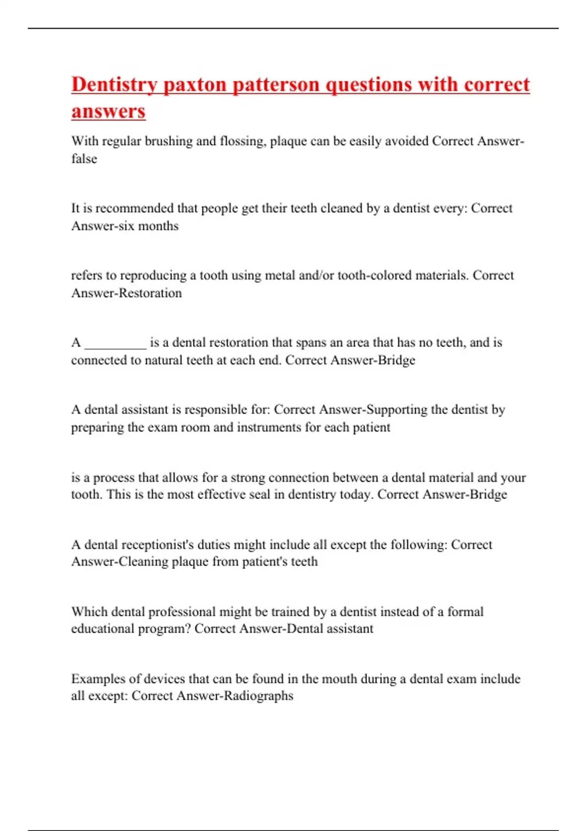 With regular brushing and flossing, plaque can be easily avoided Correct Answer-false It is recommended that people get their teeth cleaned by a dentist every: Correct Answer-six months refers to reproducing a tooth using metal and/or tooth-colored materials. Correct Answer-Restoration A _________ is a dental restoration that spans an area that has no teeth, and is connected to natural teeth at each end. Correct Answer-Bridge A dental assistant is responsible for: Correct Answer-Supporting the dentist by preparing the exam room and instruments for each patient is a process that allows for a strong connection between a dental material and your tooth. This is the most effective seal in dentistry today. Correct Answer-Bridge A dental receptionist's duties might include all except the following: Correct Answer-Cleaning plaque from patient's teeth Which dental professional might be trained by a dentist instead of a formal educational program? Correct Answer-Dental assistant Examples of devices that can be found in the mouth during a dental exam include all except: Correct Answer-Radiographs