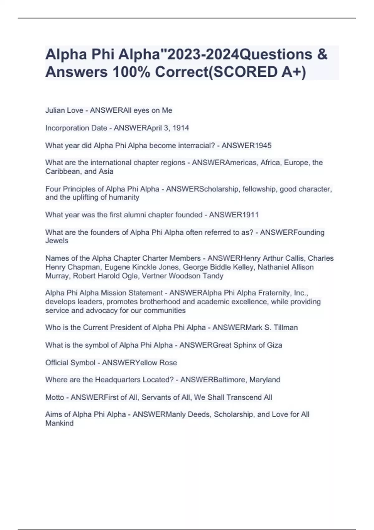 Julian Love - ANSWERAll eyes on Me Incorporation Date - ANSWERApril 3, 1914 What year did Alpha Phi Alpha become interracial? - ANSWER1945 What are the international chapter regions - ANSWERAmericas, Africa, Europe, the Caribbean, and Asia Four Principles of Alpha Phi Alpha - ANSWERScholarship, fellowship, good character, and the uplifting of humanity What year was the first alumni chapter founded - ANSWER1911 What are the founders of Alpha Phi Alpha often referred to as? - ANSWERFounding Jewels Names of the Alpha Chapter Charter Members - ANSWERHenry Arthur Callis, Charles Henry Chapman, Eugene Kinckle Jones, George Biddle Kelley, Nathaniel Allison Murray, Robert Harold Ogle, Vertner Woodson Tandy Alpha Phi Alpha Mission Statement - ANSWERAlpha Phi Alpha Fraternity, Inc., develops leaders, promotes brotherhood and academic excellence, while providing service and advocacy for our communities Who is the Current President of Alpha Phi Alpha - ANSWERMark S. Tillman What is the symbol of Alpha Phi Alpha - ANSWERGreat Sphinx of Giza Official Symbol - ANSWERYellow Rose Where are the Headquarters Located? - ANSWERBaltimore, Maryland Motto - ANSWERFirst of All, Servants of All, We Shall Transcend All Aims of Alpha Phi Alpha - ANSWERManly Deeds, Scholarship, and Love for All Mankind