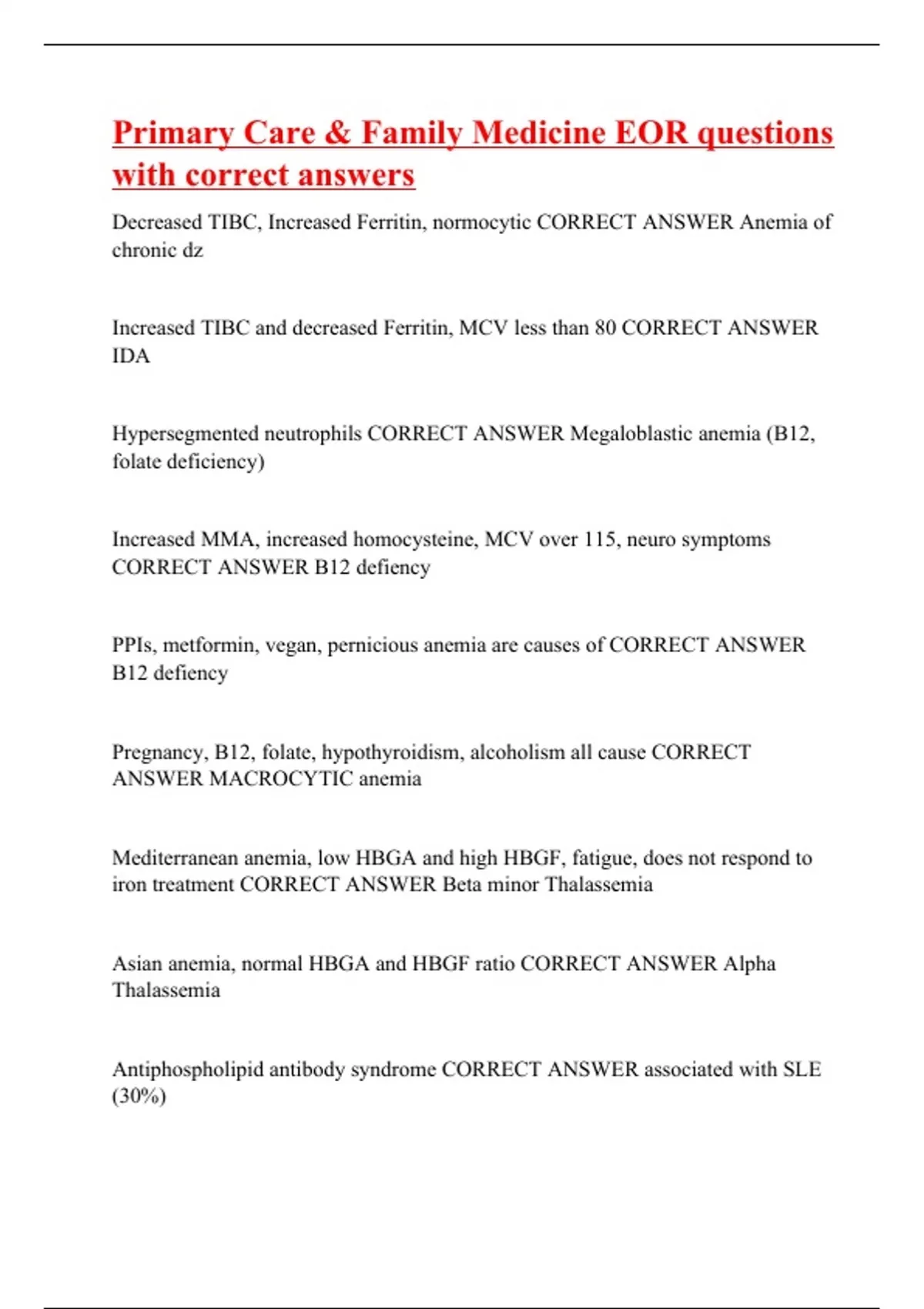 Decreased TIBC, Increased Ferritin, normocytic CORRECT ANSWER Anemia of chronic dz Increased TIBC and decreased Ferritin, MCV less than 80 CORRECT ANSWER IDA Hypersegmented neutrophils CORRECT ANSWER Megaloblastic anemia (B12, folate deficiency) Increased MMA, increased homocysteine, MCV over 115, neuro symptoms CORRECT ANSWER B12 defiency PPIs, metformin, vegan, pernicious anemia are causes of CORRECT ANSWER B12 defiency Pregnancy, B12, folate, hypothyroidism, alcoholism all cause CORRECT ANSWER MACROCYTIC anemia Mediterranean anemia, low HBGA and high HBGF, fatigue, does not respond to iron treatment CORRECT ANSWER Beta minor Thalassemia Asian anemia, normal HBGA and HBGF ratio CORRECT ANSWER Alpha Thalassemia Antiphospholipid antibody syndrome CORRECT ANSWER associated with SLE (30%) Characterized by autoantibody again