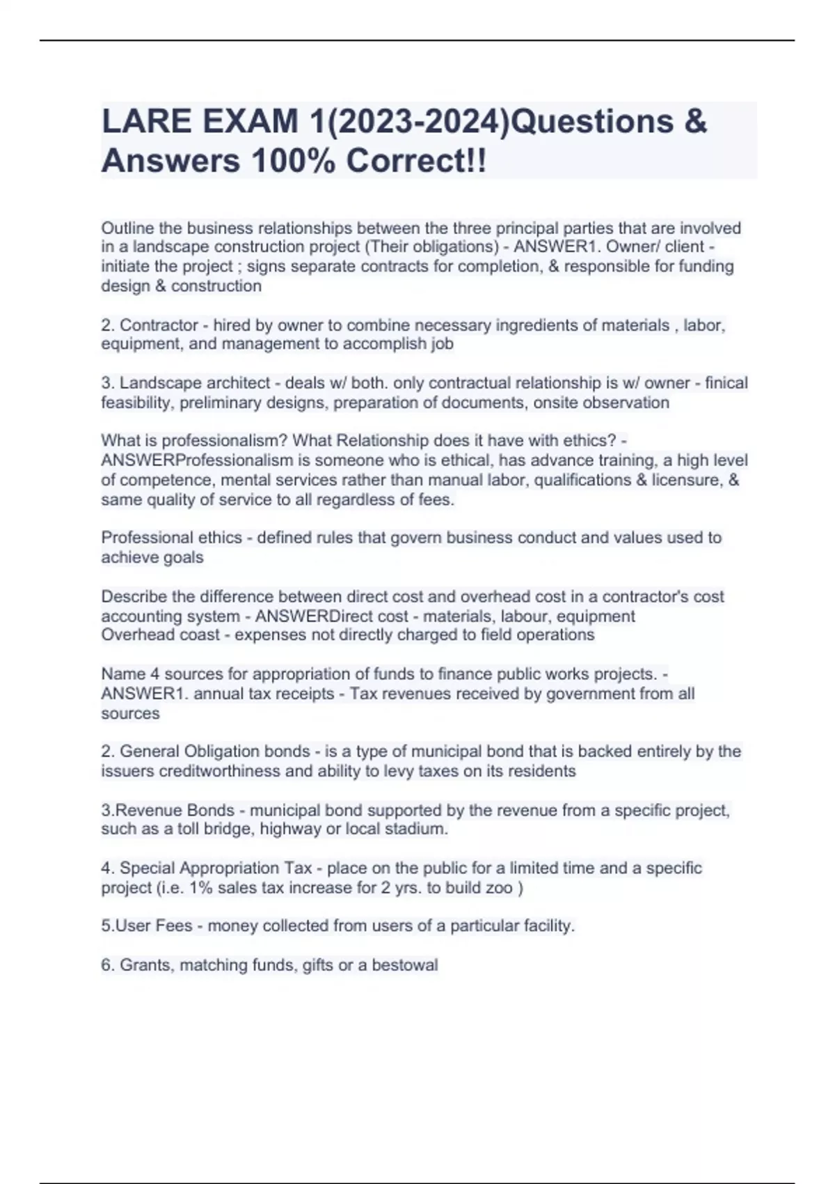 Outline the business relationships between the three principal parties that are involved in a landscape construction project (Their obligations) - ANSWER1. Owner/ client - initiate the project ; signs separate contracts for completion, & responsible for funding design & construction 2. Contractor - hired by owner to combine necessary ingredients of materials , labor, equipment, and management to accomplish job 3. Landscape architect - deals w/ both. only contractual relationship is w/ owner - finical feasibility, preliminary designs, preparation of documents, onsite observation What is professionalism? What Relationship does it have with ethics? - ANSWERProfessionalism is someone who is ethical, has advance training, a high level of competence, mental services rather than manual labor, qualifications & licensure, & same quality of service to all regardless of fees. Professional ethics - defined rules that govern business conduct and values used to achieve goals Describe the difference between direct cost and overhead cost in a contractor's cost accounting system - ANSWERDirect cost - materials, labour, equipment Overhead coast - expenses not directly charged to field operations Name 4 sources for appropriation of funds to finance public works projects. - ANSWER1. annual tax receipts - Tax revenues received by government from all sources 2. General Obligation bonds - is a type of municipal bond that is backed entirely by the issuers creditworthiness and ability to levy taxes on its residents 3.Revenue Bonds - municipal bond supported by the revenue from a specific project, such as a toll bridge, highway or local stadium. 4. Special Appropriation Tax - place on the public for a limited time and a specific project (i.e. 1% sales tax increase for 2 yrs. to build zoo ) 5.User Fees - money collected from users of a particular facility. 6. Grants, matching funds, gifts or a bestowal