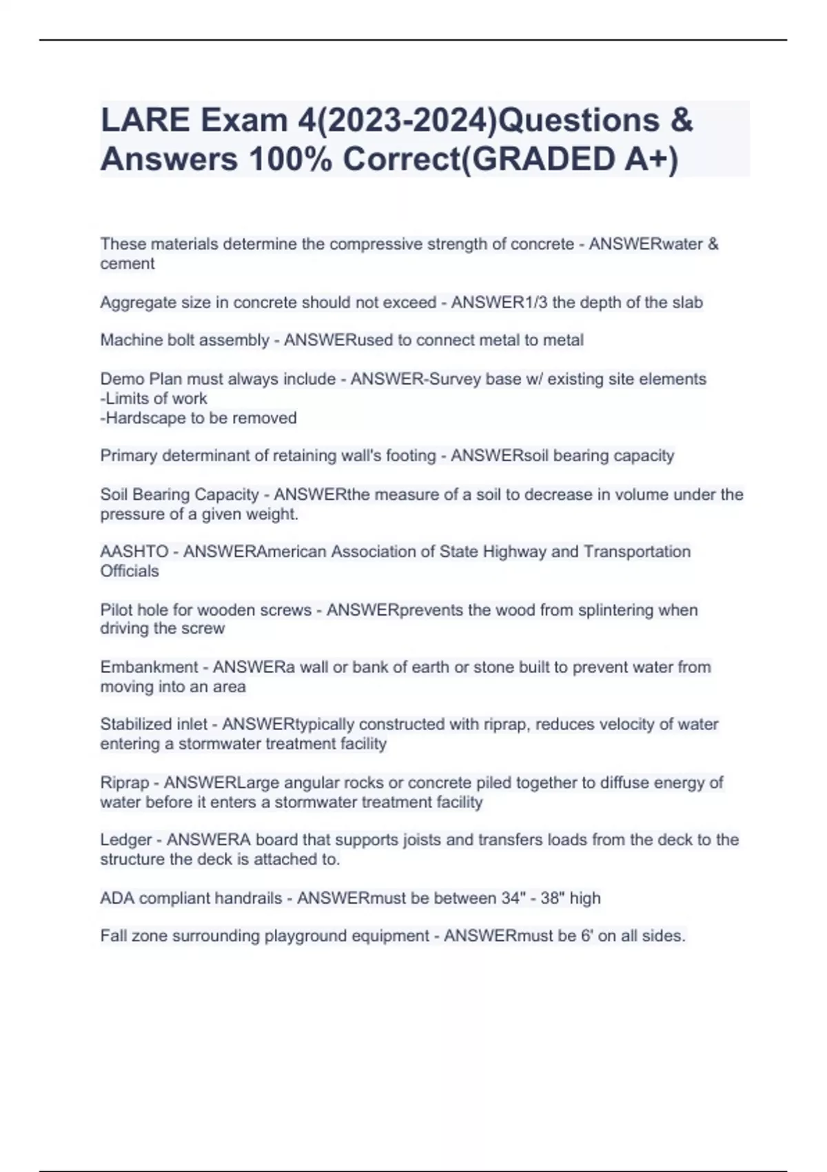 These materials determine the compressive strength of concrete - ANSWERwater & cement Aggregate size in concrete should not exceed - ANSWER1/3 the depth of the slab Machine bolt assembly - ANSWERused to connect metal to metal Demo Plan must always include - ANSWER-Survey base w/ existing site elements -Limits of work -Hardscape to be removed Primary determinant of retaining wall's footing - ANSWERsoil bearing capacity Soil Bearing Capacity - ANSWERthe measure of a soil to decrease in volume under the pressure of a given weight. AASHTO - ANSWERAmerican Association of State Highway and Transportation Officials Pilot hole for wooden screws - ANSWERprevents the wood from splintering when driving the screw Embankment - ANSWERa wall or bank of earth or stone built to prevent water from moving into an area Stabilized inlet - ANSWERtypically constructed with riprap, reduces velocity of water entering a stormwater treatment facility Riprap - ANSWERLarge angular rocks or concrete piled together to diffuse energy of water before it enters a stormwater treatment facility Ledger - ANSWERA board that supports joists and transfers loads from the deck to the structure the deck is attached to. ADA compliant handrails - ANSWERmust be between 34" - 38" high Fall zone surrounding playground equipment - ANSWERmust be 6' on all sides.