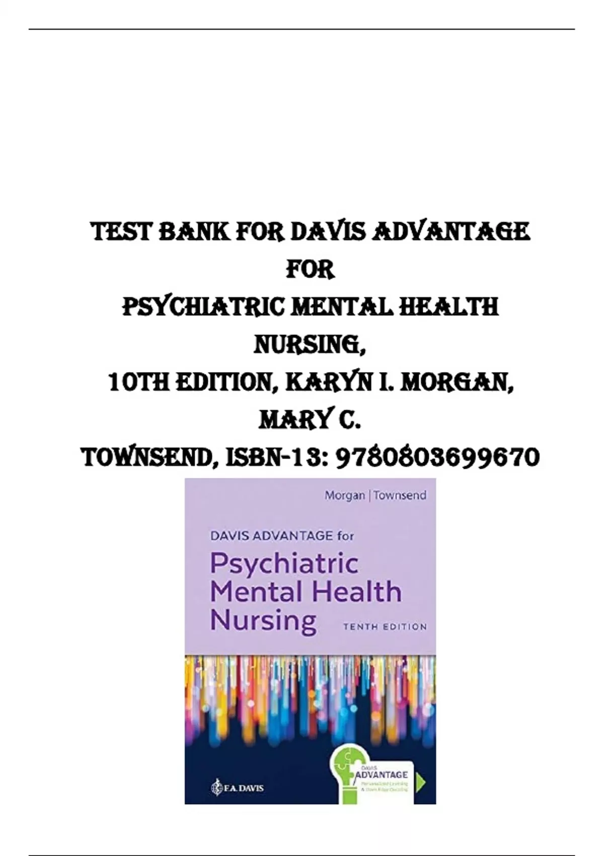 Test Bank For Davis Advantage For Psychiatric Mental Health Nursing 10th Edition, Karyn I. Morgan, Mary C. Townsend