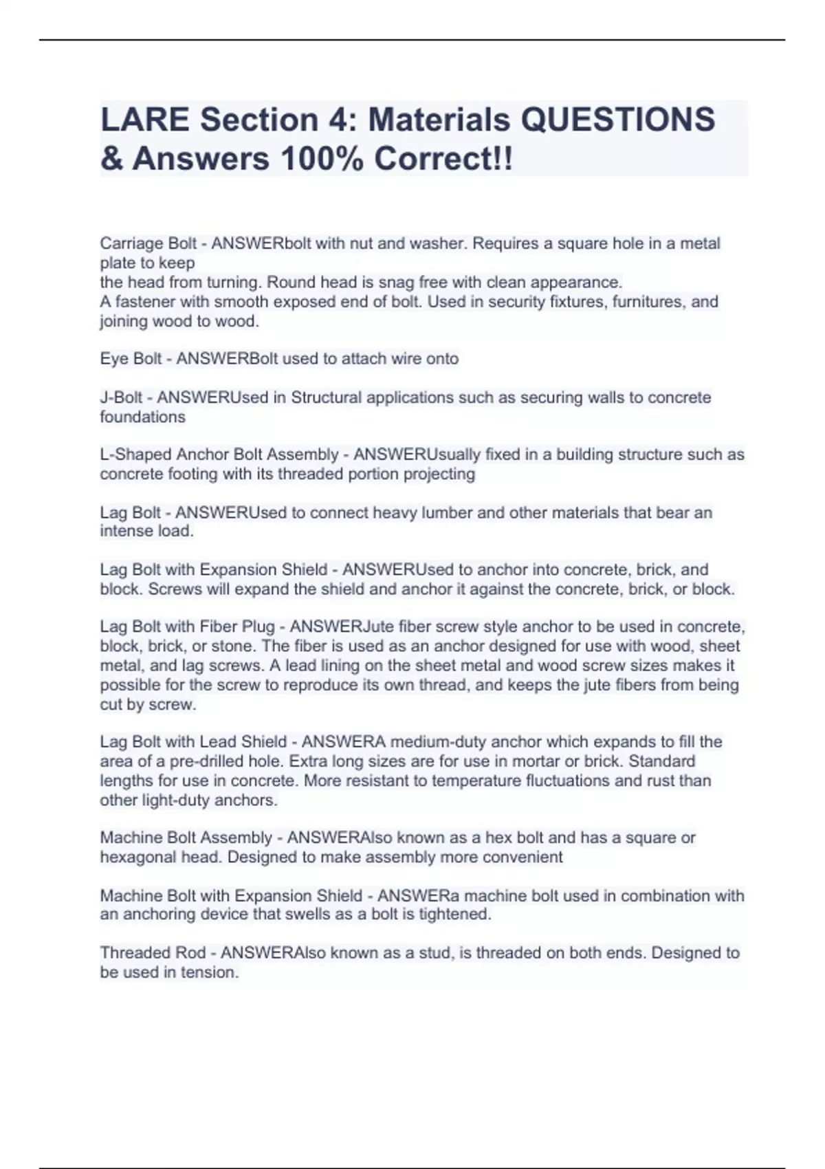 LARE Section 4: Materials QUESTIONS & Answers 100% Correct!!
