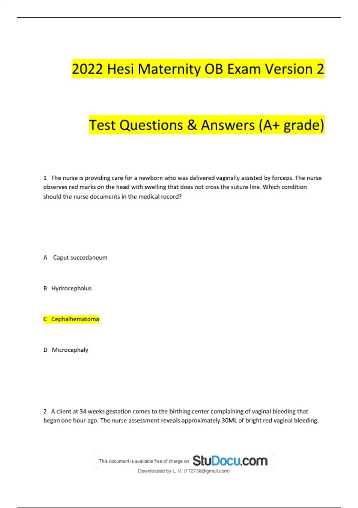 2022 hesi maternity ob exam version 2 test question