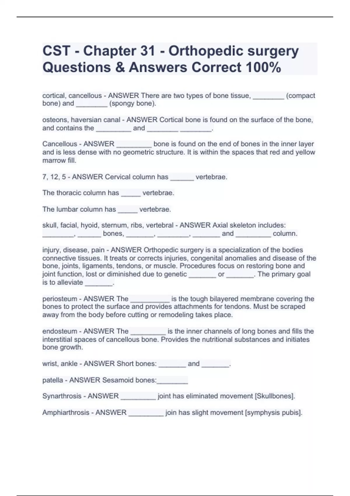 cortical, cancellous - ANSWER There are two types of bone tissue, ________ (compact bone) and ________ (spongy bone). osteons, haversian canal - ANSWER Cortical bone is found on the surface of the bone, and contains the _________ and ________ ________. Cancellous - ANSWER _________ bone is found on the end of bones in the inner layer and is less dense with no geometric structure. It is within the spaces that red and yellow marrow fill. 7, 12, 5 - ANSWER Cervical column has ______ vertebrae. The thoracic column has _____ vertebrae. The lumbar column has _____ vertebrae. skull, facial, hyoid, sternum, ribs, vertebral - ANSWER Axial skeleton includes: ________, ______ bones, _______, ________, _______ and _________ column. injury, disease, pain - ANSWER Orthopedic surgery is a specialization of the bodies connective tissues. It treats or corrects injuries, congenital anomalies and disease of the bone, joints, ligaments, tendons, or muscle. Procedures focus on restoring bone and joint function, lost or diminished due to genetic _______ or _______. The primary goal is to alleviate _______. periosteum - ANSWER The __________ is the tough bilayered membrane covering the bones to protect the surface and provides attachments for tendons. Must be scraped away from the body before cutting or remodeling takes place. endosteum - ANSWER The _________ is the inner channels of long bones and fills the interstitial spaces of cancellous bone. Provides the nutritional substances and initiates bone growth. wrist, ankle - ANSWER Short bones: _______ and _______. patella - ANSWER Sesamoid bones:________ Synarthrosis - ANSWER _________ joint has eliminated movement [Skullbones]. Amphiarthrosis - ANSWER _________ join has slight movement [symphysis pubis]. Diarthrosis - ANSWER _________ or synovial joint: freely movable [hip and shoulder]. restoring, function, pain - ANSWER Orthopedic surgery is a specialization of the bodies connective tissues. It treats or corrects injuries, congenital anomalies and disease of the bone, joints, ligaments, tendons, or muscle. Procedures focus on _____ bone and joint _____, lost or diminished due to genetic injury or disease. The primary goal is to alleviate _____. soft tissues - ANSWER Our skeleton is a structural support for the ____ _____ of the body. It is divided into axial and appendicular. upper, lower, pelvis - ANSWER The appendicular skeleton includes the _____ extremities, _____ extremities and the _____. Upper - ANSWER The _____ extremities include the scapula, clavicle, humorous, glenoid fossa, ulnar, radius, carpal, and metacarpals. Lower - ANSWER _____ extremities include the ilium, ischium, pubis, femur, patella, tibia, fibula, calcaneus, cuboid, navicular, personals, and metatarsals. Endosteum - ANSWER The ______ is the inner channels of long bones and fills the interstitial spaces of cancellous bone. Provides the nutritional substances and initiates bone growth. diaphysis, epiphysis - ANSWER Long bones are characterized by the ______ (the middle shaft) and the ______ (the two ends). epiphyseal - ANSWER Break in the ______plate and a child may delay bone growth. Long - ANSWER _____ bones have shafts that are composed of compact bone with a hollow center. medullary canal - ANSWER Mature long bones have a hollow cavity called the _____ _____. cancellous - ANSWER The epiphysis is wider and has protrusions where ligaments are attached. This is composed of ______ bone that forms joints. This is covered with cartilage to strengthen the joint and reduced friction between the bones. Irregular - ANSWER ____ bones: vertebrae, spine and face. Flat - ANSWER _____ bones: ribs, cranial bones, scapula and sternum. vertebrae, spine, face - ANSWER Irregular bones: ____, ____, and ____. Landmarks, projections - ANSWER _____ or areas of attachment for ligaments provide a pathway for nerves and blood vessels. They appear as _____, bumps, ridges, channels and tunnels. Synarthrosis, amphiarthrosis, Diarthrosis (or synovial): - ANSWER Joints are classified according to the degree of movement they allow in the shape of the articulating surface. ______ has limited movement [Skullbones]. And ______ has slight movement [symphysis pubis]. _______: freely movable [hip and shoulder]. synovial - ANSWER The ______ joint consists of articulating bone ends, connective tissues that surround and bind them. The joint capsule surrounds joint, containing nerves and blood vessels. Synovial, capsule - ANSWER The _____ membrane of each joint lines the capsule, provides viscous fluid that lubricates and nourishes the joint. The joint cavity is the space inside the joint _____ [during arthroscopic instruments enter this space]. Nonsynovial - ANSWER ______ joints are separated by immovable cartilaginous or fibrous tissue. elbow, knee - ANSWER Hinge joint: ____ and _____ thumb - ANSWER Saddle joint: _____ (only) spine - ANSWER Gliding joint: _____ Ball, socket - ANSWER ______ and _____ joint: hip and shoulder Pivot - ANSWER ______ joint 1st and 2nd vertebrae (neck) Condyloid - ANSWER ______joint: wrist, ankles wrist, ankles - ANSWER Condyloid joint: _____ and _____ Tendons - ANSWER ______ attach muscle to bone. It moves within a protective sheet filled with synovial fluid movement to the muscle system. Ligaments - ANSWER ________ attach bone to bone. This provides flexibility and strength to the skeletal structure. When attached to cartilage, they stabilize the joint and limit movements that might injure it. The tendons or ligaments do not have a significant blood supply. striated, smooth, and cardiac - ANSWER The three major types of muscle in the human body: _____, ______, and _____. CST - Chapter 31 - Orthopedic surgery Questions & Answers Correct 100%