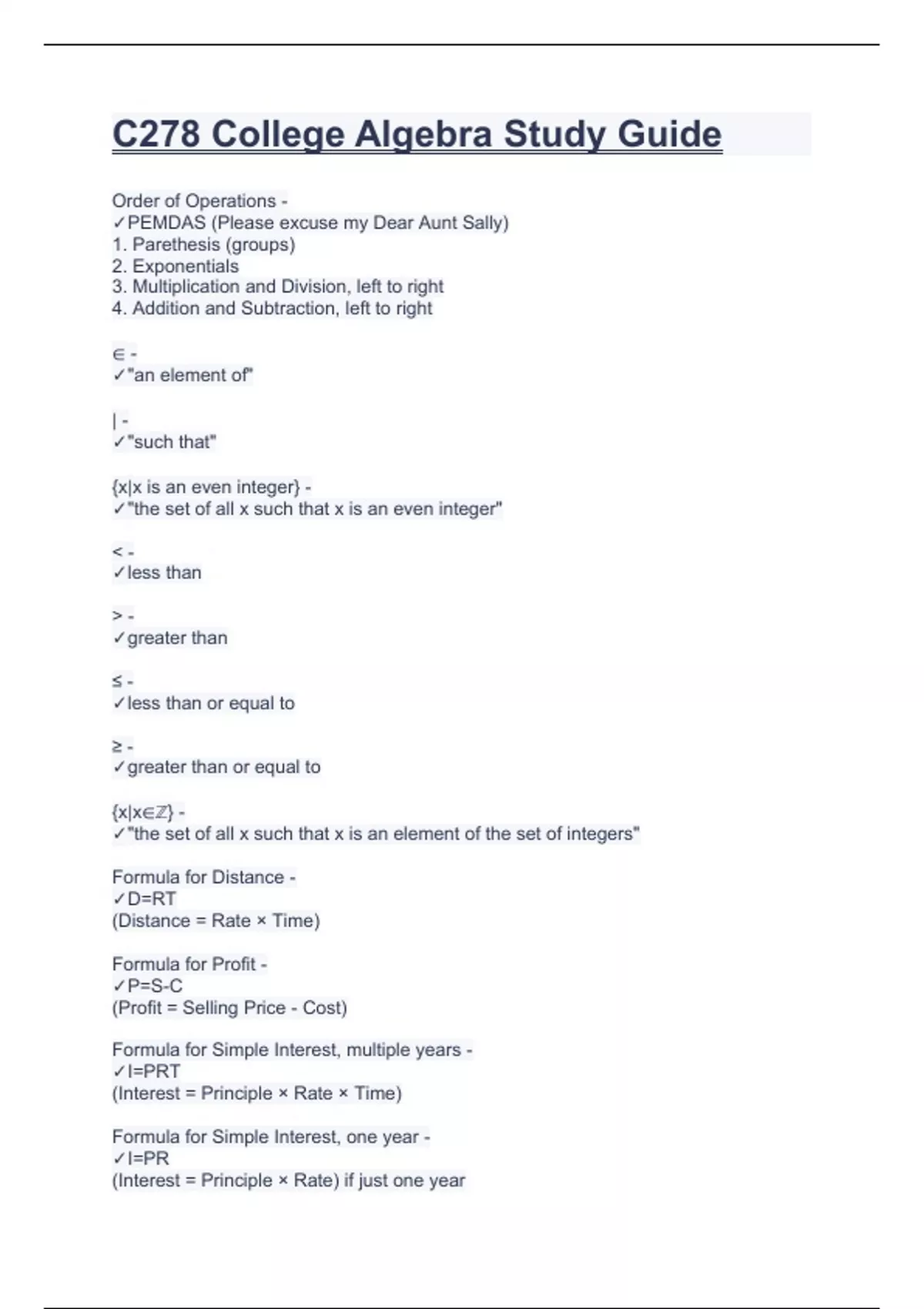 C278 College Algebra Study Guide.