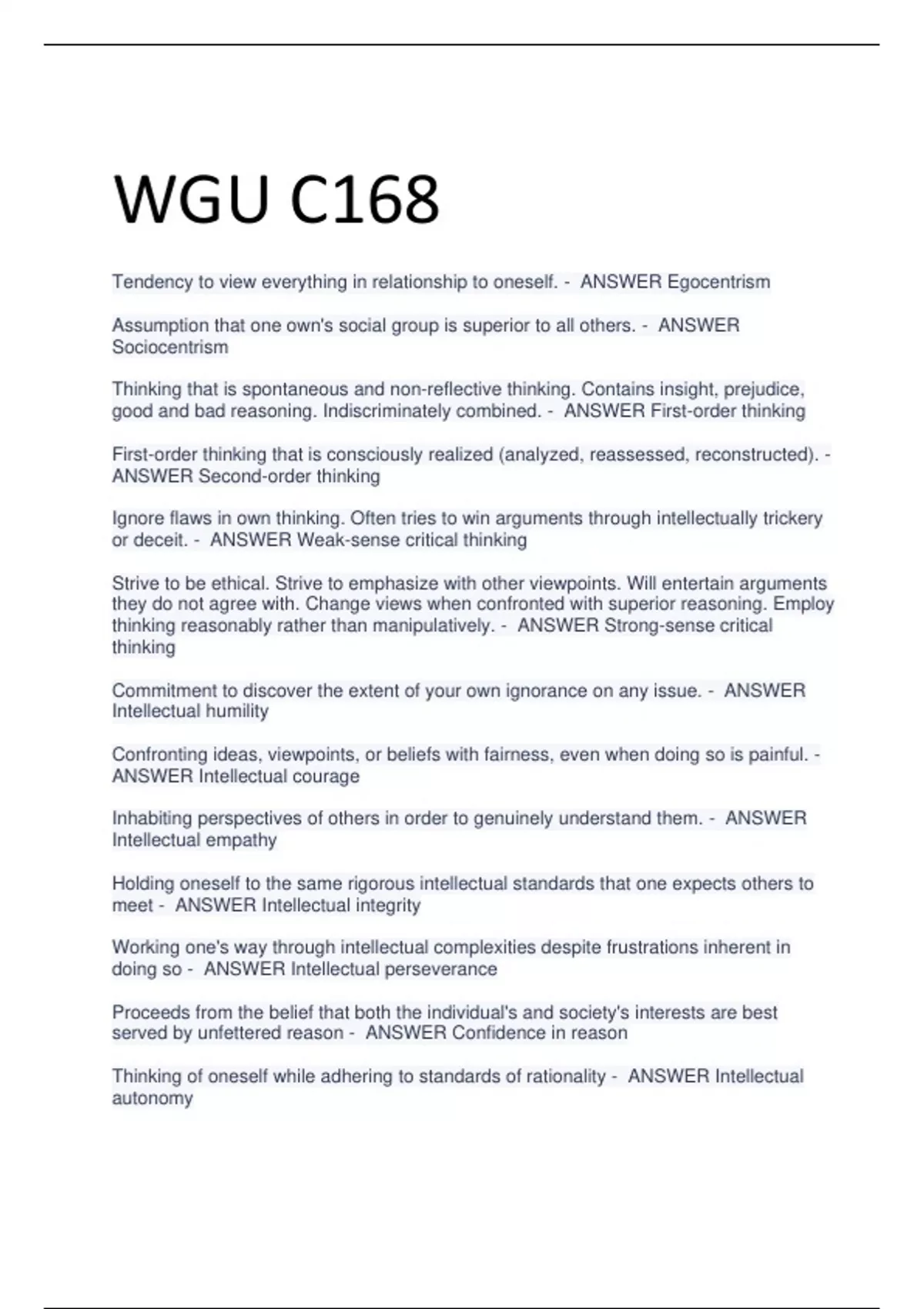 Tendency to view everything in relationship to oneself. - ANSWER Egocentrism Assumption that one own's social group is superior to all others. - ANSWER Sociocentrism