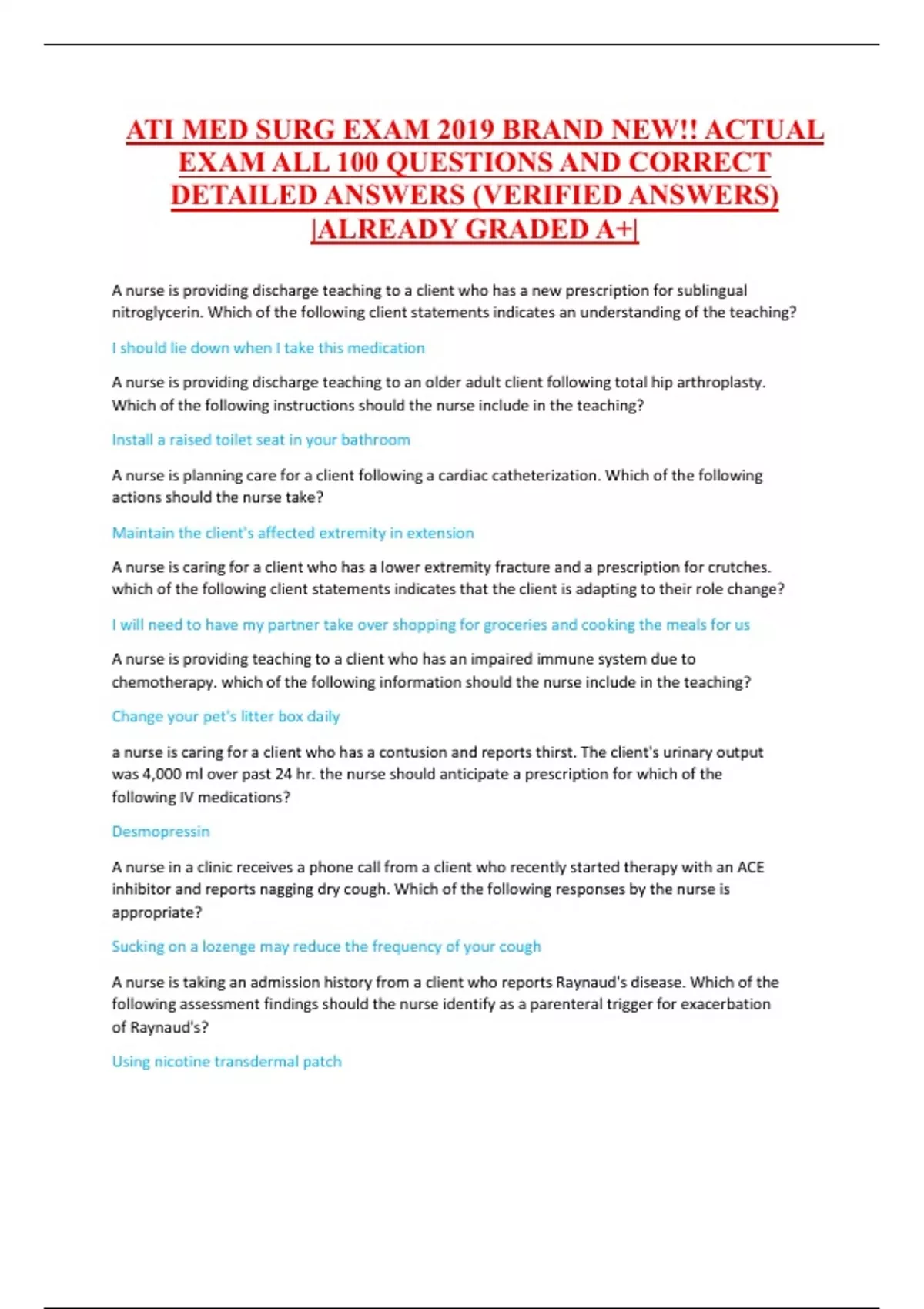 ATI MED SURG EXAM 2019 BRAND NEW!! ACTUAL EXAM ALL 100 QUESTIONS AND CORRECT DETAILED ANSWERS (VERIFIED ANSWERS) |ALREADY GRADED A+| A nurse is providing discharge teaching to a client who has a new prescription for sublingual nitroglycerin. Which of the following client statements indicates an understanding of the teaching? I should lie down when I take this medication A nurse is providing discharge teaching to an older adult client following total hip arthroplasty. Which of the following instructions should the nurse include in the teaching? Install a raised toilet seat in your bathroom A nurse is planning care for a client following a cardiac catheterization. Which of the following actions should the nurse take? Maintain the client's affected extremity in extension A nurse is caring for a client who has a lower extremity fracture and a prescription for crutches. which of the following client statements indicates that the client is adapting to their role change? I will need to have my partner take over shopping for groceries and cooking the meals for us A nurse is providing teaching to a client who has an impaired immune system due to chemotherapy. which of the following information should the nurse include in the teaching? Change your pet's litter box daily a nurse is caring for a client who has a contusion and reports thirst. The client's urinary output was 4,000 ml over past 24 hr. the nurse should anticipate a prescription for which of the following IV medications? Desmopressin A nurse in a clinic receives a phone call from a client who recently started therapy with an ACE inhibitor and reports nagging dry cough. Which of the following responses by the nurse is appropriate? Sucking on a lozenge may reduce the frequency of your cough A nurse is taking an admission history from a client who reports Raynaud's disease. Which of the following assessment findings should the nurse identify as a parenteral trigger for exacerbation of Raynaud's? Using nicotine transdermal patch A nurse is caring for a client who has a central venous device and notes the tubing has become disconnected. the client develops dyspnea and tachycardia. Which of the following actions should the nurse take first? Clamp the catheter A nurse is completing an assessment of an older client and notes reddened areas over the bony prominences, but the client's skin is intact. which of the following interventions should the nurse include in the plan of care? Support bony prominences with pillows A home health nurse is making an initial visit to a client who has multiple sclerosis. Which of the following actions is the priority for the nurse to take? Provide coping strategies for client and family A nurse in the emergency department is assessing a client. which of the following actions should the nurse take first? (click on the "exhibit" button for additional information about the client.) Initiate airborne precautions A nurse is reviewing the medical record of a client to identify factors for colorectal cancer. The nurse should identify which of the following findings as increasing the client's risk? History of Crohn's disease A nurse is caring for a client who is scheduled for a mastectomy. The client tells the nurse, "I'm not sure I want to have a mastectomy." Which of the following statements should the nurse make? I can give you additional information about the procedure A nurse is preparing to administer a unit of packed RBCs to a client who is anemic. Identify the sequence of steps the nurse should follow 1. obtain venous access using a 19-gauge needle 2. Obtain the unit of a packed RBCs from blood bank 3. verify blood compatibility with another nurse 4. Initiate transfusion of the unit of packed RBCs 5. Remain with the client for the first 15 to 30 minutes A nurse is providing discharge teaching to a client following a modified left radical mastectomy with breast expander. Which of the following statements by the client indicates an understanding of the teaching? I should expect less than 25 ml of secretions per day in the drainage devices A critical care nurse is assessing a client who has a severe head injury. In response to painful stimuli, the client does not open her eyes, displays decerebrate posturing and make