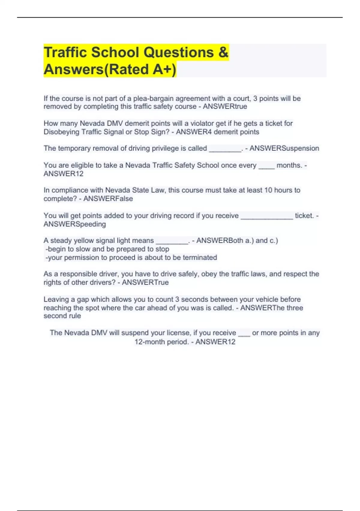 Traffic School Questions & Answers(Rated A+)