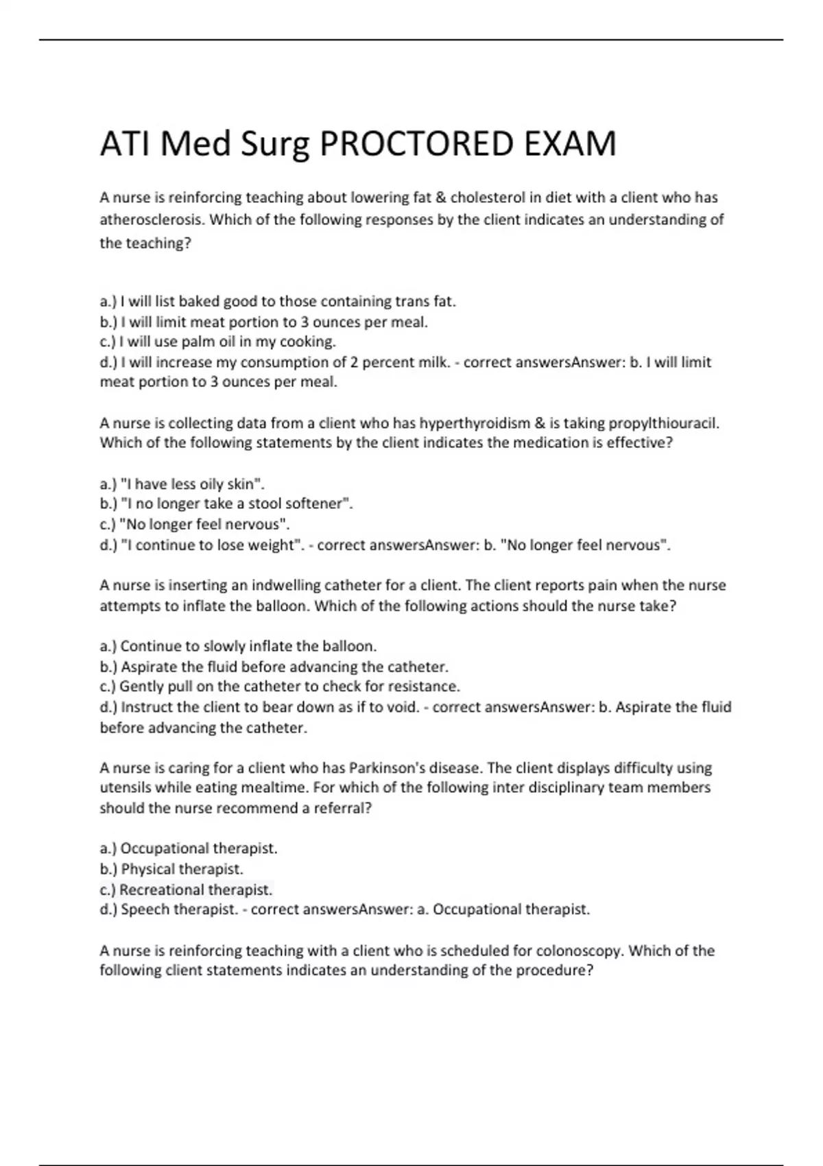ATI Med Surg PROCTORED EXAM A nurse is reinforcing teaching about lowering fat & cholesterol in diet with a client who has atherosclerosis. Which of the following responses by the client indicates an understanding of the teaching? a.) I will list baked good to those containing trans fat. b.) I will limit meat portion to 3 ounces per meal. c.) I will use palm oil in my cooking. d.) I will increase my consumption of 2 percent milk. - correct answersAnswer: b. I will limit meat portion to 3 ounces per meal. A nurse is collecting data from a client who has hyperthyroidism & is taking propylthiouracil. Which of the following statements by the client indicates the medication is effective? a.) "I have less oily skin". b.) "I no longer take a stool softener". c.) "No longer feel nervous". d.) "I continue to lose weight". - correct answersAnswer: b. "No longer feel nervous". A nurse is inserting an indwelling catheter for a client. The client reports pain when the nurse attempts to inflate the balloon. Which of the following actions should the nurse take? a.) Continue to slowly inflate the balloon. b.) Aspirate the fluid before advancing the catheter. c.) Gently pull on the catheter to check for resistance. d.) Instruct the client to bear down as if to void. - correct answersAnswer: b. Aspirate the fluid before advancing the catheter. A nurse is caring for a client who has Parkinson's disease. The client displays difficulty using utensils while eating mealtime. For which of the following inter disciplinary team members should the nurse recommend a referral? a.) Occupational therapist. b.) Physical therapist. c.) Recreational therapist. d.) Speech therapist. - correct answersAnswer: a. Occupational therapist. A nurse is reinforcing teaching with a client who is scheduled for colonoscopy. Which of the following client statements indicates an understanding of the procedure? a.) I will need arrangements for a ride home. b.) I should call the doctor if I feel bloated after the procedure. c.) I plan to eat light breakfast the morning of the procedure. d.) I can expect to have a sore throat from the breathing tube. - correct answersAnswer: a. I will need arrangements for a ride home. A nurse is preparing to enter the room of a client who has tuberculosis. Which of the following personal protective equipment should the nurse wear? a.) No breather mask. b.) Surgical mask. c.) Respirator mask. d.) Venturi mask. - correct answersAnswer: c.) Respirator mask. A nurse is caring for an older adult client who has constipation. Which of the following actions should the nurse take? a.) Instruct the client to limit activity. b.) Encourage a low residue diet. c.) Provide a glass of warm water before breakfast. d.) Offer foods high in potassium. - correct answersAnswer: b. Encourage a low residue diet. A nurse is collecting data from a client who has been admitted with suspected appendicitis. Which of the following findings is the nurse's priority to report to the provider? a.) WBC count 15,000/mm3 b.) Loss of appetite. c.) Rigid board like abdomen. d.) Temperature of 37.8 c. - correct answersAnswer: c.) Rigid board like abdomen. A nurse is collecting data from a female client during an initial health assessment. Which of the following findings should the nurse identify as a risk fact for osteoporosis? a.) Uses a beclomethason inhaler. b.) Applies an estrogen vaginal cream daily. c.) Walks 30 mins per day. d.) Includes canned sardines in her diet. - correct answersAnswer: b. Applies an estrogen vaginal cream daily. A nurse is collecting data from a client who began taking catopril 2 days ago. Which of the following findings should the nurse report to the provider immediately? a.) Dizziness.