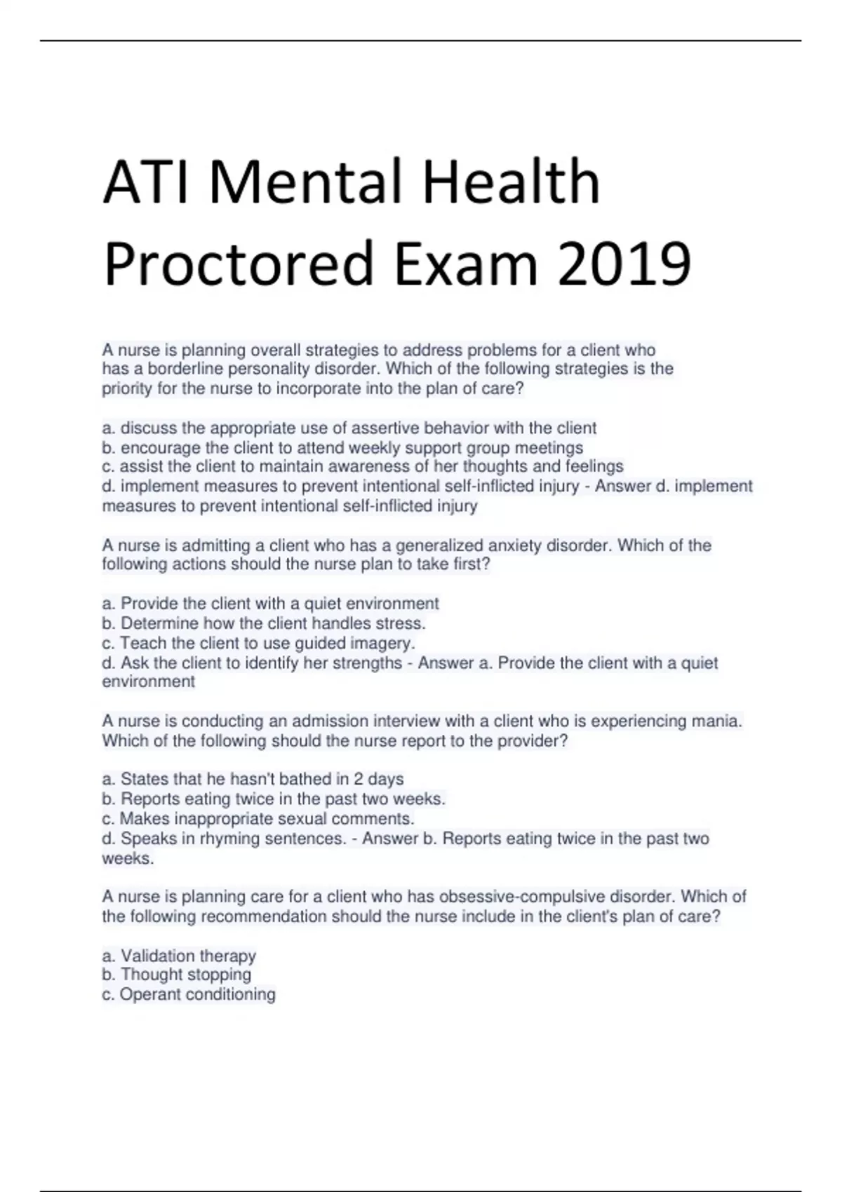 ATI Mental Health Proctored Exam 2019 A nurse is planning overall strategies to address problems for a client who has a borderline personality disorder. Which of the following strategies is the priority for the nurse to incorporate into the plan of care? a. discuss the appropriate use of assertive behavior with the client b. encourage the client to attend weekly support group meetings c. assist the client to maintain awareness of her thoughts and feelings d. implement measures to prevent intentional self-inflicted injury - Answer d. implement measures to prevent intentional self-inflicted injury A nurse is admitting a client who has a generalized anxiety disorder. Which of the following actions should the nurse plan to take first? a. Provide the client with a quiet environment b. Determine how the client handles stress. c. Teach the client to use guided imagery. d. Ask the client to identify her strengths - Answer a. Provide the client with a quiet environment A nurse is conducting an admission interview with a client who is experiencing mania. Which of the following should the nurse report to the provider? a. States that he hasn't bathed in 2 days b. Reports eating twice in the past two weeks. c. Makes inappropriate sexual comments. d. Speaks in rhyming sentences. - Answer b. Reports eating twice in the past two weeks. A nurse is planning care for a client who has obsessive-compulsive disorder. Which of the following recommendation should the nurse include in the client's plan of care? a. Validation therapy b. Thought stopping c. Operant conditioning d. Reality orientation therapy - Answer b. Thought stopping A nurse is caring for a client who has bipolar disorder and is experiencing a manic episode. Which of the following actions should the nurse take? a. Encourage the client to join group activities b. Dim the lights in the client's room c. Provide detailed explanations to the client d. Administer methylphenidate - Answer b. Dim the lights in the client's room A nurse is leading a crisis intervention group for adolescents who witnessed the suicide of a classmate. Which of the following actions should the nurse take first? a. Initiate referrals b. Review community resources c. Identify prior coping skills d. Discuss the importance of confidentiality - Answer c. Identify prior coping skills A nurse overhears a client saying"I am a spy, a spy for the FBI .I am an I,an eye for an eye in the sky. Sky is up high." The nurse should document the client's statement as which of the following speech alterations? a. Echolalia b. Word salad c. Neologism d. Clang association - Answer d. Clang association An older adult client is brought to the mental health clinic by her daughter. The daughter reports that her mother is not eating and seems uninterested in routine activities. The daughter states "Im so worried that my mother is depressed" which of the following responses should the nurse make? a. Everyone gets depressed from time to time. b. You shouldn't worry about this because the depressive disorder is easily treated. c. Older adults are usually diagnosed with the depressive disorder as they age. d. Tell me the reasons you think your mother is depressed. - Answer d. Tell me the reasons you think your mother is depressed. A nurse is planning care for an adolescent who has autism spectrum disorder. Which of the following outcomes should the nurse include in the plan care? a. Meets own needs without manipulating others. b. Initiates social interactions with caregivers. c. Changes behavior as a result of peer pressure. d. Acknowledges his delusions are not real. - Answer b. Initiates social interactions with caregivers. A nurse is providing behavior therapy for a client who has obsessive-compulsive disorder. The client repeatedly checks that the doors are locked at night. Which of the following instructions should the nurse give the client when using thought stopping technique? a. Snap a rubber band on your wrist when you think about checking the locks. b. Ask a family member to check the locks for you at night. c. Focus on abdominal breathing whenever you go to check the locks. d. Keep a journal of how often you check the locks each night. - Answer a. Snap a rubber band on your wrist when you think about checking the locks. A nurse is caring for a client who is starting treatment for substance use disorder. Which of the following actions indicates the nurse is practicing the ethical principle of nonmaleficence? a. Provide the client with quality care regardless of their ability to pay for treatment. b. Educating the client about legal rights concerning treatment. c. Withholding the prescribed medication that is causing adverse effects for the client. d. Being truthful with the client about the manifestations of withdrawal. - Answer c. Withholding the prescribed medication that is causing adverse effects for the client. A nurse in a group home facility is caring for a client who is developmentally disabled. The client has been stealing belongings from other clients. Which of the following techniques should the nurse use? a. Crisis intervention to decrease anxiety. b. Aversion therapy to provide distraction c. Positive reinforcement to increase desired behavior. d. Systematic desensitization to extinguish the behavior. - Answer c. Positive reinforcement to increase desired behavior. A nurse is caring for a client wh