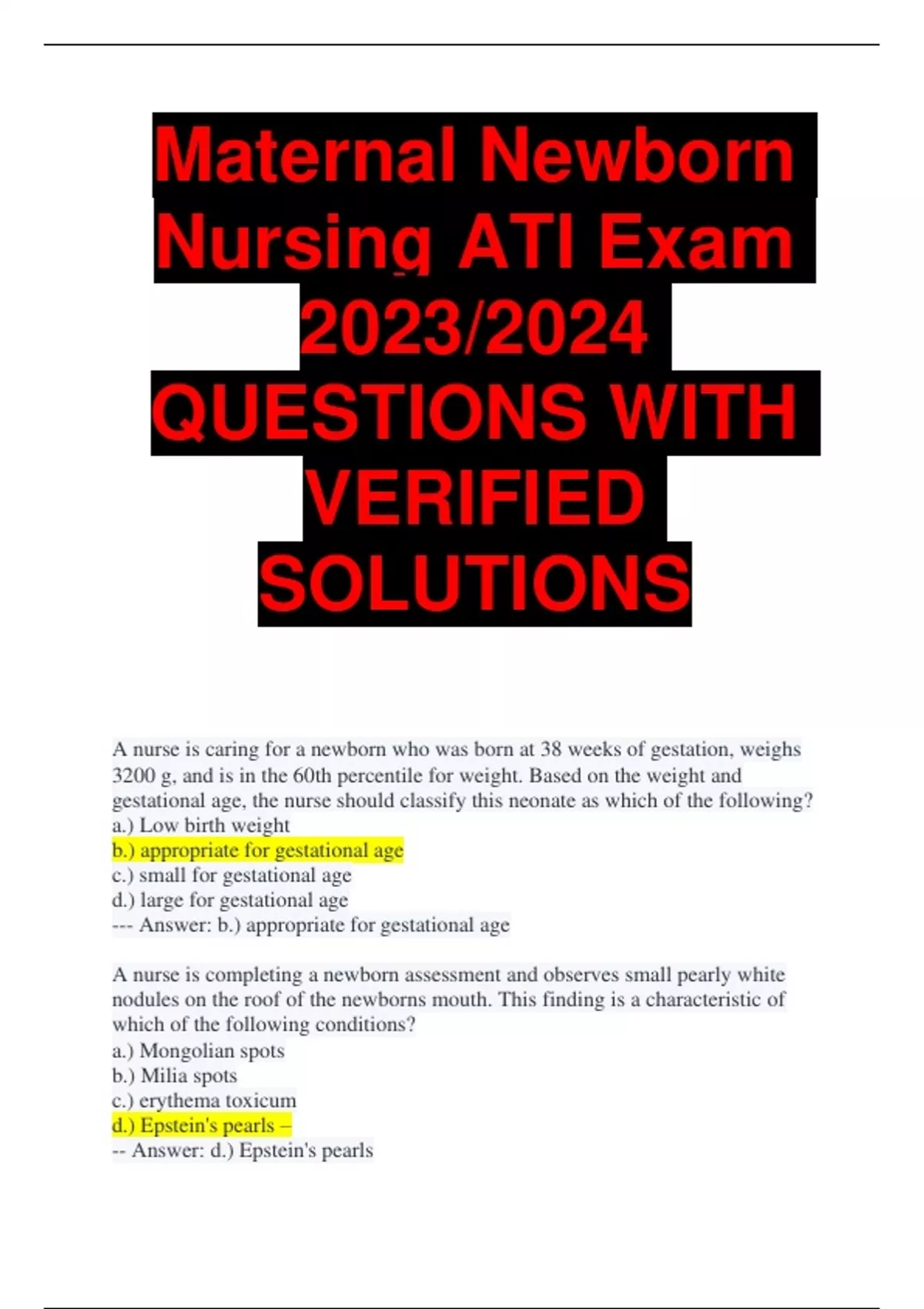 Maternal Newborn Nursing ATI Exam 2023/2024 QUESTIONS WITH VERIFIED SOLUTIONS