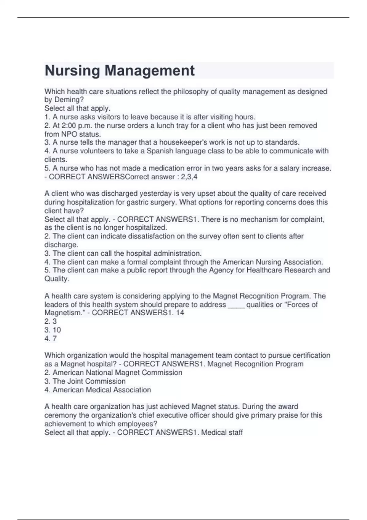 Which health care situations reflect the philosophy of quality management as designed by Deming? Select all that apply. 1. A nurse asks visitors to leave because it is after visiting hours. 2. At 2:00 p.m. the nurse orders a lunch tray for a client who has just been removed from NPO status. 3. A nurse tells the manager that a housekeeper's work is not up to standards. 4. A nurse volunteers to take a Spanish language class to be able to communicate with clients. 5. A nurse who has not made a medication error in two years asks for a salary increase. - CORRECT ANSWERSCorrect answer : 2,3,4 A client who was discharged yesterday is very upset about the quality of care received during hospitalization for gastric surgery. What options for reporting concerns does this client have? Select all that apply. - CORRECT ANSWERS1. There is no mechanism for complaint, as the client is no longer hospitalized. 2. The client can indicate dissatisfaction on the survey often sent to clients after discharge. 3. The client can call the hospital administration. 4. The client can make a formal complaint through the American Nursing Association. 5. The client can make a public report through the Agency for Healthcare Research and Quality.
