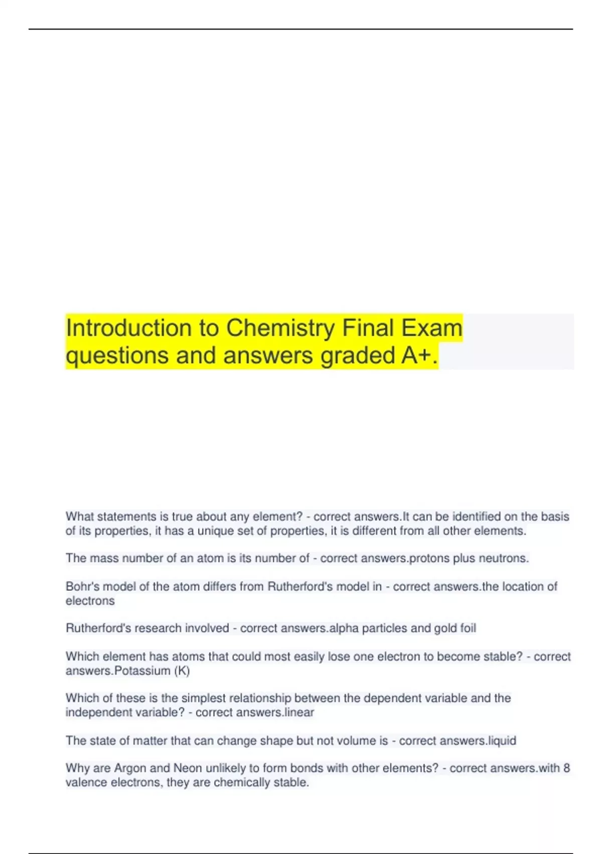 Introduction to Chemistry Final Exam questions and answers graded A+. What statements is true about any element? - correct answers.It can be identified on the basis of its properties, it has a unique set of properties, it is different from all other elements. The mass number of an atom is its number of - correct ns plus neutrons. Bohr's model of the atom differs from Rutherford's model in - correct location of electrons Rutherford's research involved - correct particles and gold foil Which element has atoms that could most easily lose one electron to become stable? - correct answers.Potassium (K) Which of these is the simplest relationship between the dependent variable and the independent variable? - correct r The state of matter that can change shape but not volume is - correct d Why are Argon and Neon unlikely to form bonds with other elements? - correct 8 valence electrons, they are chemically stable. Aristotle thought that - correct matter consists of 4 elements. Which element is likely to be shiny and able to conduct electricity and heat? - correct answers.Beryllium When a fluorine atom gains an electron, it becomes a(n) - correct . The particles of a(n) ______ solid have no definite pattern. - correct hous A(n) ______ consists of atoms or molecules that spread out to fill their container. - correct The sun and other stars consist of matter in the ______ state. - correct a Amontons' law describes the relationship between the temperature and ______ of gases. - correct ure The law relating the volume and pressure of gases is ______ law. - correct answers.Boyle's The temperature at which is a solid changes to a liquid is its ______. - correct ng point A solid changes directly to a gas in the process of ______ . - correct mation The boiling point of water is ______ °C. - correct answers.100 True or False: Making ice cubes with tap water is an example of a chemical change. - correct answers.False True or False: All changes in matter can be reversed. - correct answers.False True or False: Melting metal changes it into an entirely different substance. - correct answers.False True or False: The release of gas bubbles is a possible sign of a chemical change. - correct answers.True True or False: After a physical change, matter still has the same chemical properties. - correct answers.True The ability of a substance to combine chemically with other substances is called ______. - correct ivity All ______ has properties of mass and volume. - correct r The ability of matter to conduct electricity is a(n) ______ property of matter. - correct cal A 20-kg object with a volume of 2 meters cubed has a density of ______. - correct answers.10 kg/m^3 ______ properties of matter can be measured only when matter changes to different substances. - correct cal