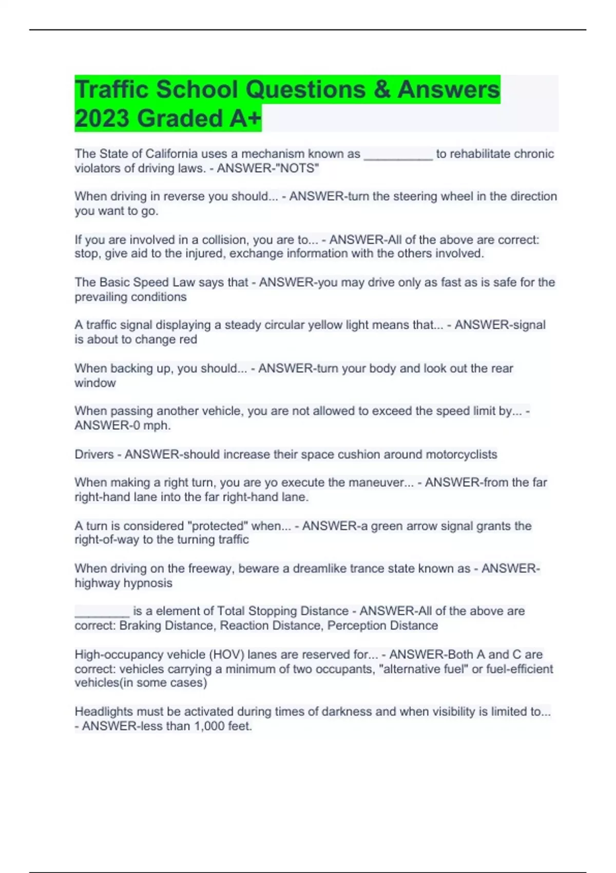 The State of California uses a mechanism known as __________ to rehabilitate chronic violators of driving laws. - ANSWER-"NOTS" When driving in reverse you should... - ANSWER-turn the steering wheel in the direction you want to go. If you are involved in a collision, you are to... - ANSWER-All of the above are correct: stop, give aid to the injured, exchange information with the others involved. The Basic Speed Law says that - ANSWER-you may drive only as fast as is safe for the prevailing conditions A traffic signal displaying a steady circular yellow light means that... - ANSWER-signal is about to change red When backing up, you should... - ANSWER-turn your body and look out the rear window When passing another vehicle, you are not allowed to exceed the speed limit by... - ANSWER-0 mph. Drivers - ANSWER-should increase their space cushion around motorcyclists When making a right turn, you are yo execute the maneuver... - ANSWER-from the far right-hand lane into the far right-hand lane. A turn is considered "protected" when... - ANSWER-a green arrow signal grants the right-of-way to the turning traffic When driving on the freeway, beware a dreamlike trance state known as - ANSWER-highway hypnosis ________ is a element of Total Stopping Distance - ANSWER-All of the above are correct: Braking Distance, Reaction Distance, Perception Distance High-occupancy vehicle (HOV) lanes are reserved for... - ANSWER-Both A and C are correct: vehicles carrying a minimum of two occupants, "alternative fuel" or fuel-efficient vehicles(in some cases) Headlights must be activated during times of darkness and when visibility is limited to... - ANSWER-less than 1,000 feet.