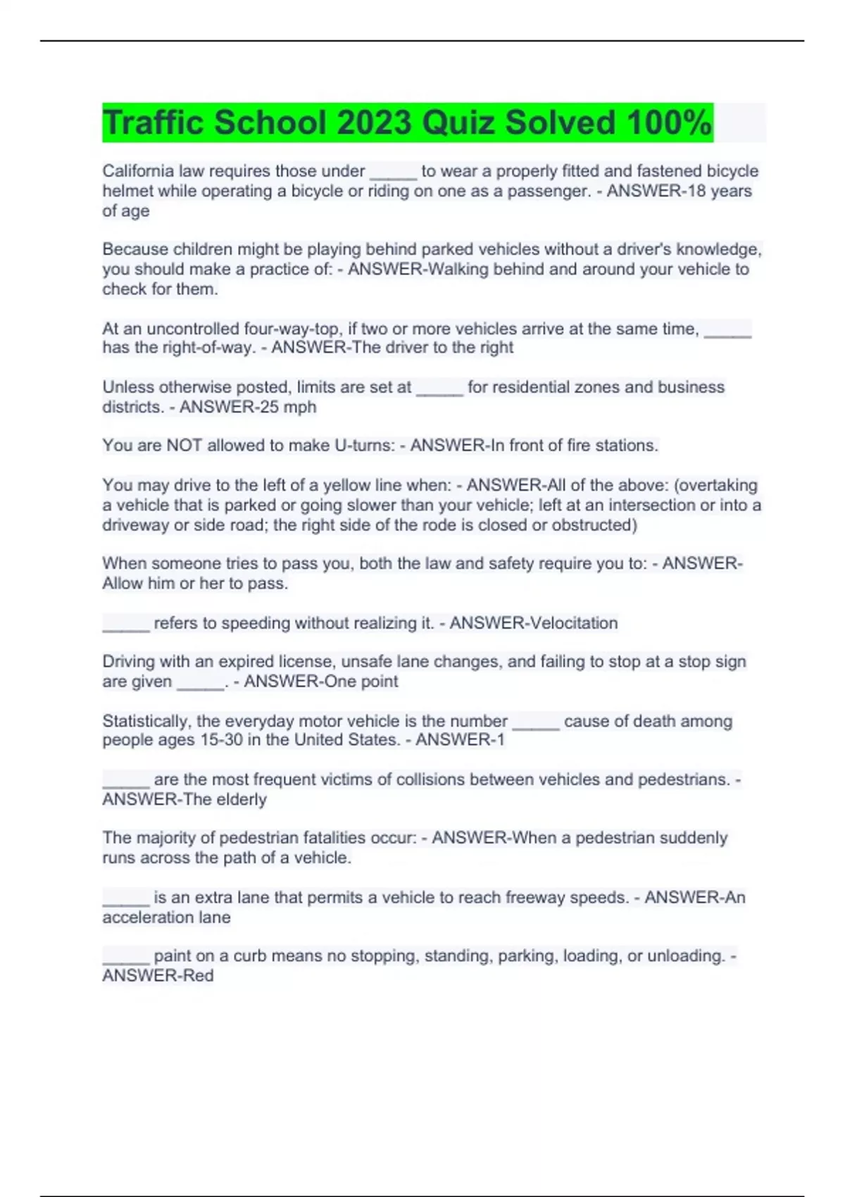 California law requires those under _____ to wear a properly fitted and fastened bicycle helmet while operating a bicycle or riding on one as a passenger. - ANSWER-18 years of age Because children might be playing behind parked vehicles without a driver's knowledge, you should make a practice of: - ANSWER-Walking behind and around your vehicle to check for them. At an uncontrolled four-way-top, if two or more vehicles arrive at the same time, _____ has the right-of-way. - ANSWER-The driver to the right Unless otherwise posted, limits are set at _____ for residential zones and business districts. - ANSWER-25 mph You are NOT allowed to make U-turns: - ANSWER-In front of fire stations. You may drive to the left of a yellow line when: - ANSWER-All of the above: (overtaking a vehicle that is parked or going slower than your vehicle; left at an intersection or into a driveway or side road; the right side of the rode is closed or obstructed) When someone tries to pass you, both the law and safety require you to: - ANSWER-Allow him or her to pass. _____ refers to speeding without realizing it. - ANSWER-Velocitation Driving with an expired license, unsafe lane changes, and failing to stop at a stop sign are given _____. - ANSWER-One point Statistically, the everyday motor vehicle is the number _____ cause of death among people ages 15-30 in the United States. - ANSWER-1 _____ are the most frequent victims of collisions between vehicles and pedestrians. - ANSWER-The elderly The majority of pedestrian fatalities occur: - ANSWER-When a pedestrian suddenly runs across the path of a vehicle. _____ is an extra lane that permits a vehicle to reach freeway speeds. - ANSWER-An acceleration lane _____ paint on a curb means no stopping, standing, parking, loading, or unloading. - ANSWER-Red