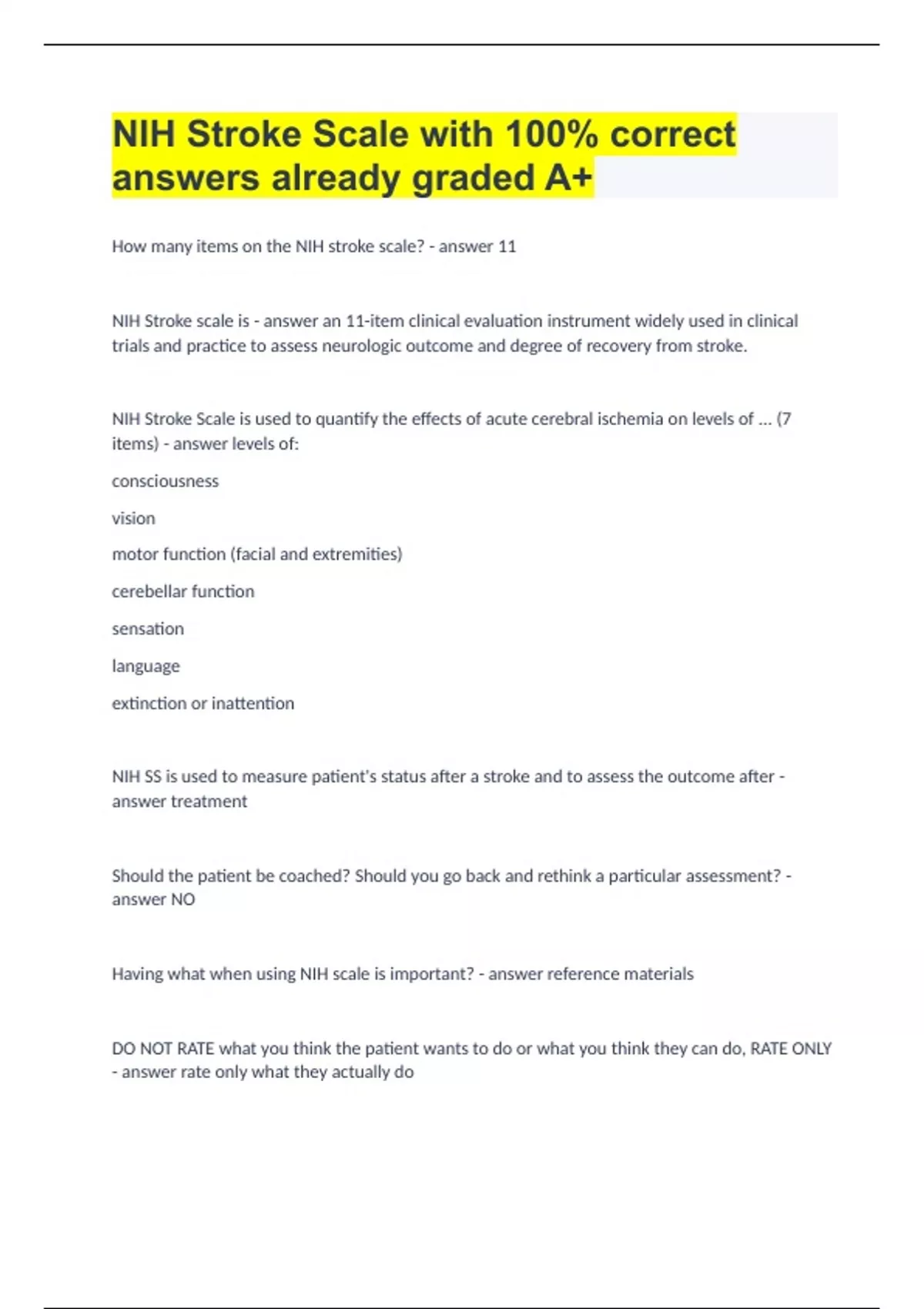 NIH Stroke Scale with 100% correct answers already graded A+