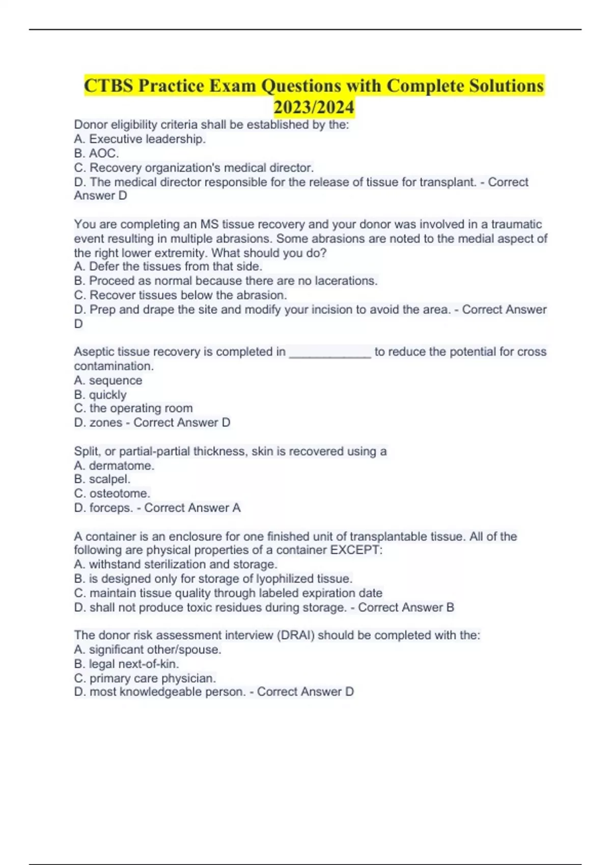 CTBS Practice Exam Questions with Complete Solutions 2023/2024 Donor eligibility criteria shall be established by the: A. Executive leadership. B. AOC. C. Recovery organization's medical director. D. The medical director responsible for the release of tissue for transplant. - Correct Answer D You are completing an MS tissue recovery and your donor was involved in a traumatic event resulting in multiple abrasions. Some abrasions are noted to the medial aspect of the right lower extremity. What should you do? A. Defer the tissues from that side. B. Proceed as normal because there are no lacerations. C. Recover tissues below the abrasion. D. Prep and drape the site and modify your incision to avoid the area. - Correct Answer D Aseptic tissue recovery is completed in ____________ to reduce the potential for cross contamination. A. sequence B. quickly C. the operating room D. zones - Correct Answer D Split, or partial-partial thickness, skin is recovered using a A. dermatome. B. scalpel. C. osteotome. D. forceps. - Correct Answer A A container is an enclosure for one finished unit of transplantable tissue. All of the following are physical properties of a container EXCEPT: A. withstand sterilization and storage. B. is designed only for storage of lyophilized tissue. C. maintain tissue quality through labeled expiration date D. shall not produce toxic residues during storage. - Correct Answer B The donor risk assessment interview (DRAI) should be completed with the: A. significant other/spouse. B. legal next-of-kin. C. primary care physician. D. most knowledgeable person. - Correct Answer D Donation mu