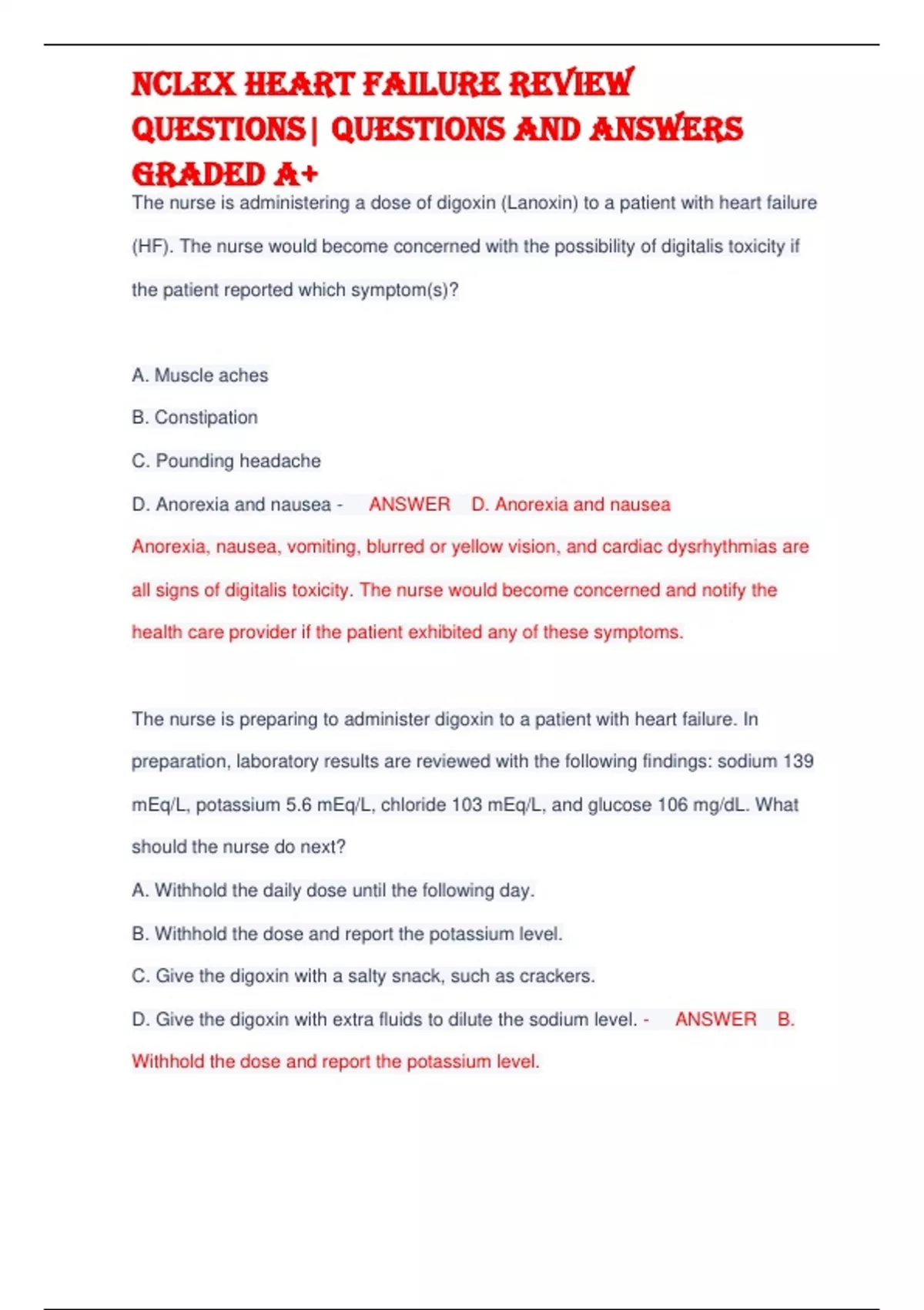 The nurse is administering a dose of digoxin (Lanoxin) to a patient with heart failure (HF). The nurse would become concerned with the possibility of digitalis toxicity if the patient reported which symptom(s)? A. Muscle aches B. Constipation C. Pounding headache D. Anorexia and nausea - ANSWER D. Anorexia and nausea Anorexia, nausea, vomiting, blurred or yellow vision, and cardiac dysrhythmias are all signs of digitalis toxicity. The nurse would become concerned and notify the health care provider if the patient exhibited any of these symptoms. The nurse is preparing to administer digoxin to a patient with heart failure. In preparation, laboratory results are reviewed with the following findings: sodium 139 mEq/L, potassium 5.6 mEq/L, chloride 103 mEq/L, and glucose 106 mg/dL. What should the nurse do next? A. Withhold the daily dose until the following day. B. Withhold the dose and report the potassium level. C. Give the digoxin with a salty snack, such as crackers. D. Give the digoxin with extra fluids to dilute the sodium level. - ANSWER B. Withhold the dose and report the potassium level. Nclex Heart Failure review QuestioNs| QuestioNs aNd aNswers graded a+ The normal potassium level is 3.5 to 5.0 mEq/L. The patient is hyperkalemic, which makes the patient more prone to digoxin toxicity. For this reason, the nurse should withhold the dose and report the potassium level. The physician may order the digoxin to be given once the potassium level has been treated and decreases to within normal range. What is the priority assessment by the nurse caring for a patient receiving IV nesiritide (Natrecor) to treat heart failure? A. Urine output B. Lung sounds C. Blood pressure D. Respiratory rate - ANSWER C. Blood pressure Although all identified assessments are appropriate for a patient receiving IV nesiritide, the priority assessment would be monitoring for hypotension, the main adverse effect of nesiritide. A patient admitted with heart failure appears very anxious and complains of shortness of breath. Which nursing actions would be appropriate to alleviate this patient's anxiety (select all that apply)? A. Administer ordered morphine sulfate. B. Position patient in a semi-Fowler's position. C. Position patient on left side with head of bed flat
