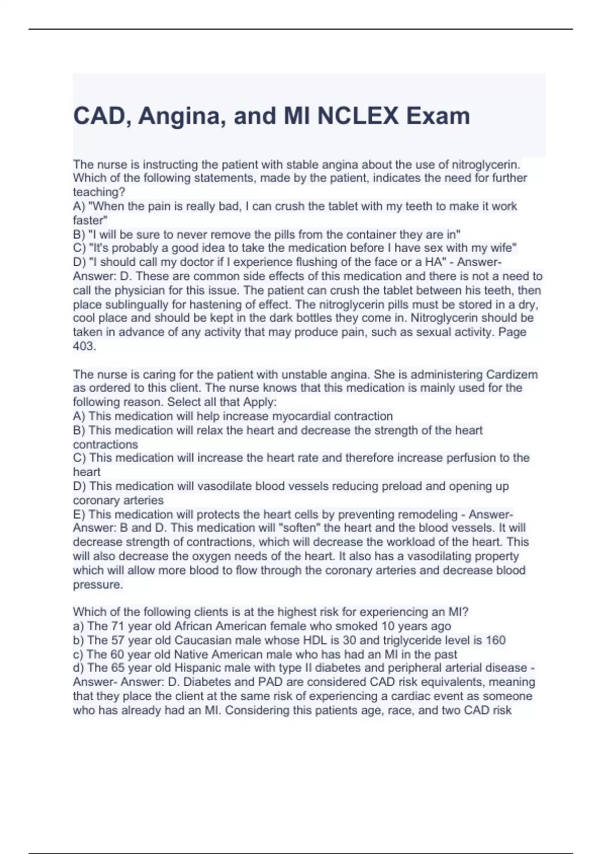 CAD, Angina, and MI NCLEX Exam 2023 with complete solutions